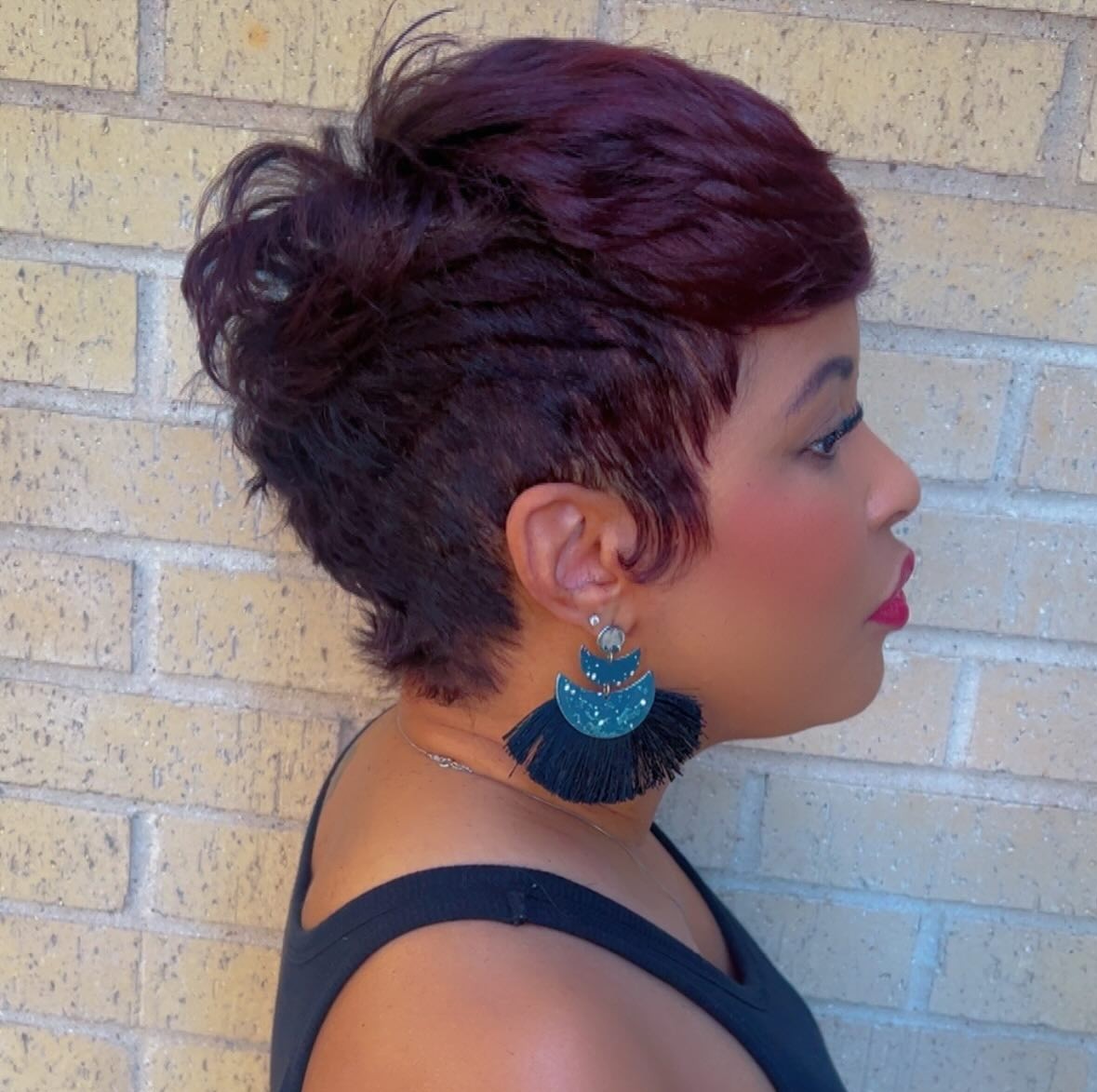 Combine layers and vivid color to brighten up your simple pixie cut. You can still have rather short hair while holding onto your femininity with this fun style that looks great with a punched-up color flattering deep complections. Perfect to stress facial features!