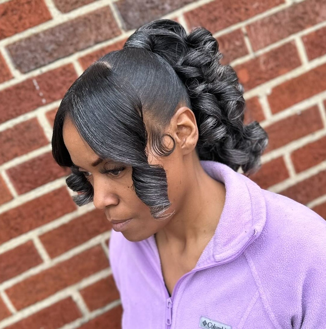 Voluminous spiral curls are stunning not only in long hairstyles but also in short chic ponytails. Wrap the base with curly ponytail extensions and complement the look with dramatic baby hair and vibrant jewelry.