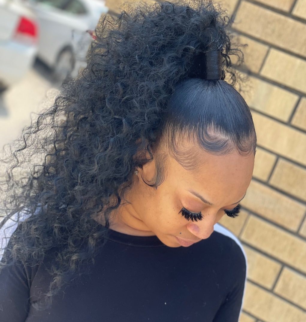 Voluminous spiral curls are stunning not only in long hairstyles but also in short chic ponytails. Wrap the base with curly ponytail extensions and complement the look with dramatic baby hair and vibrant jewelry.
