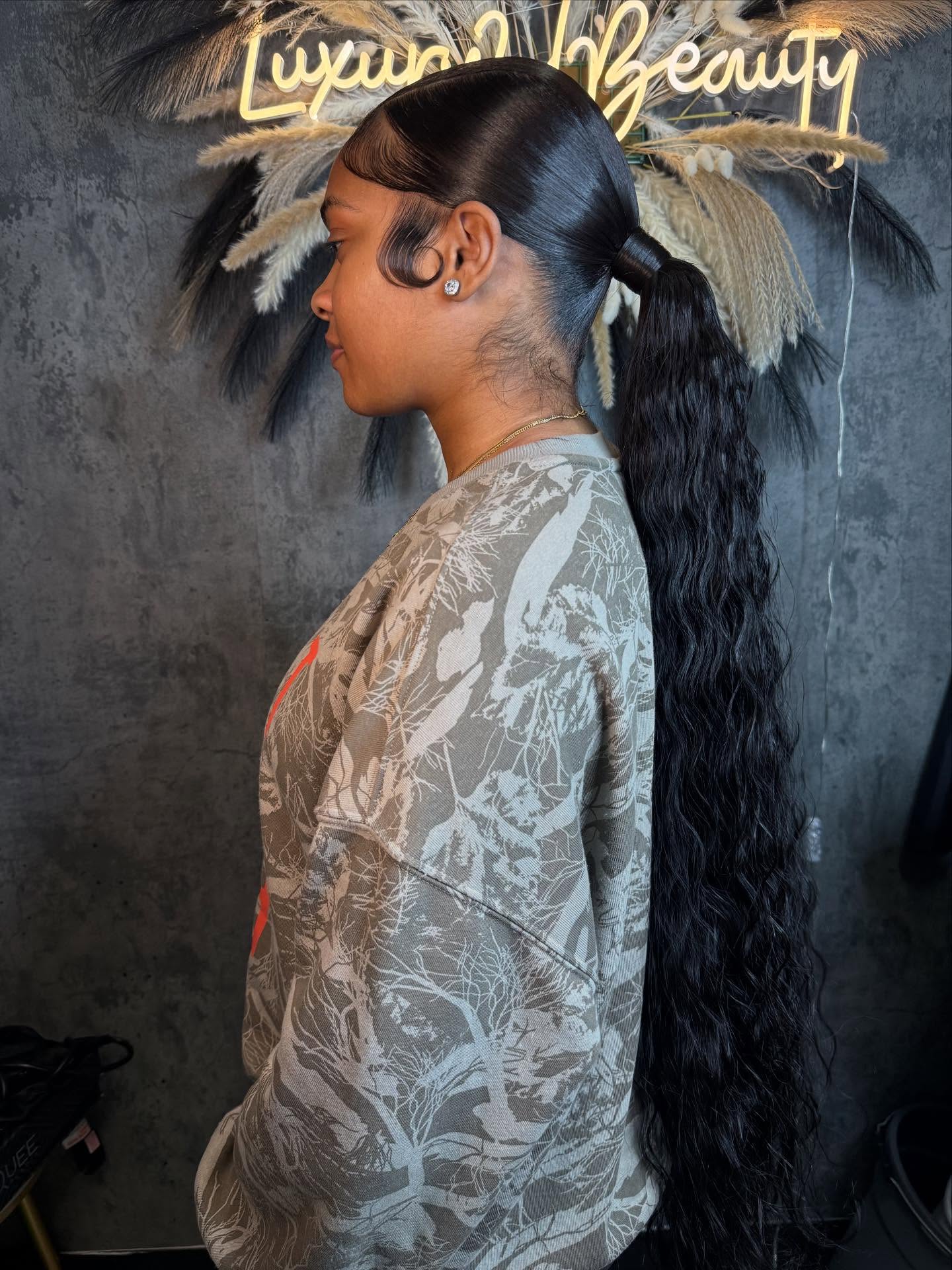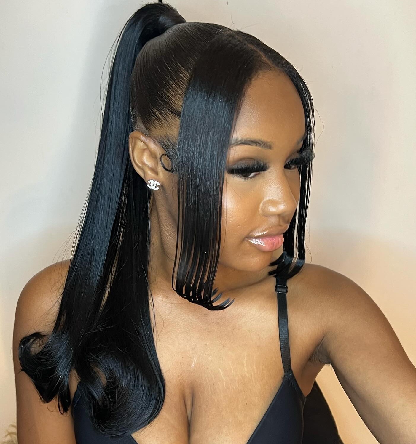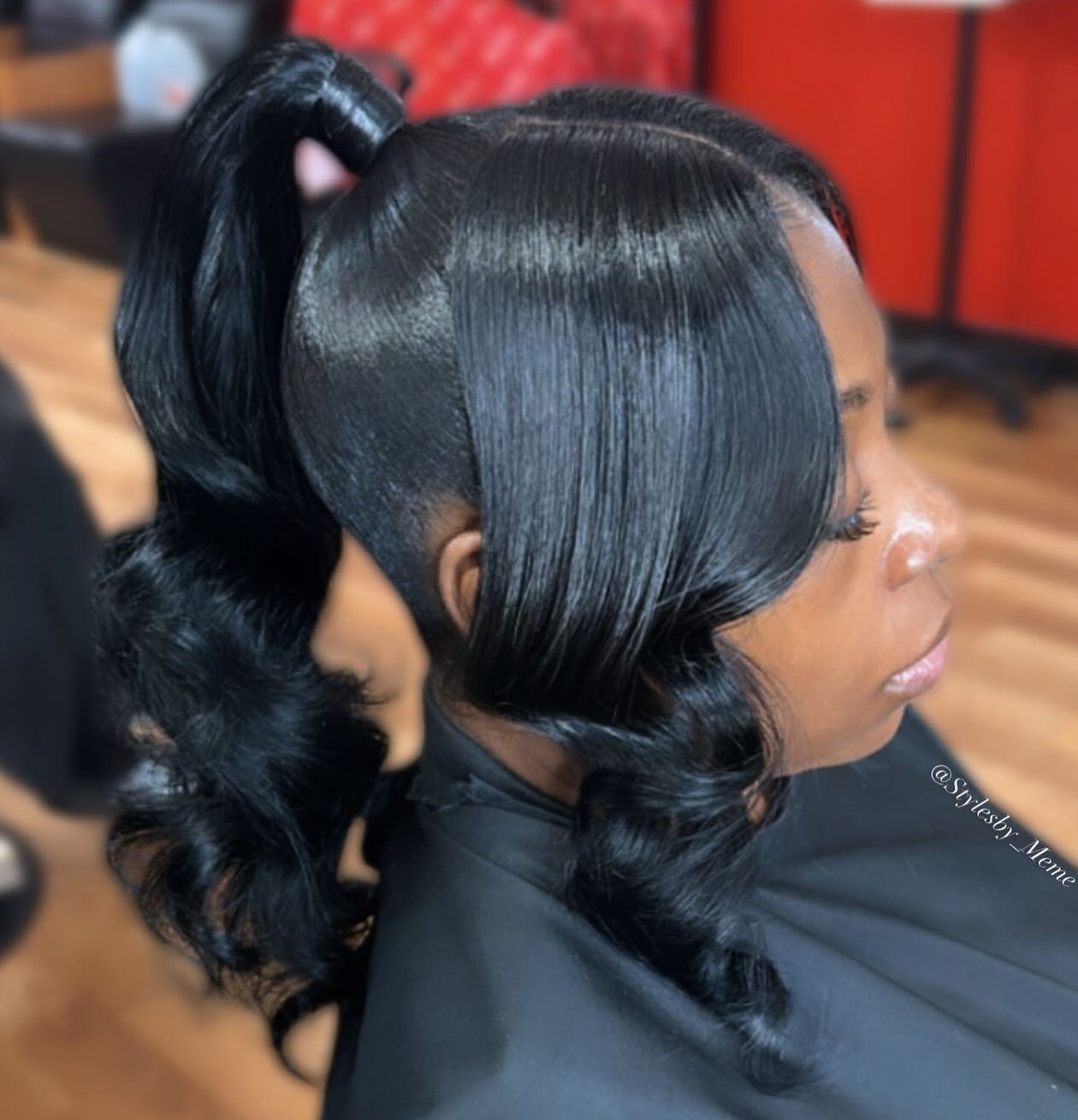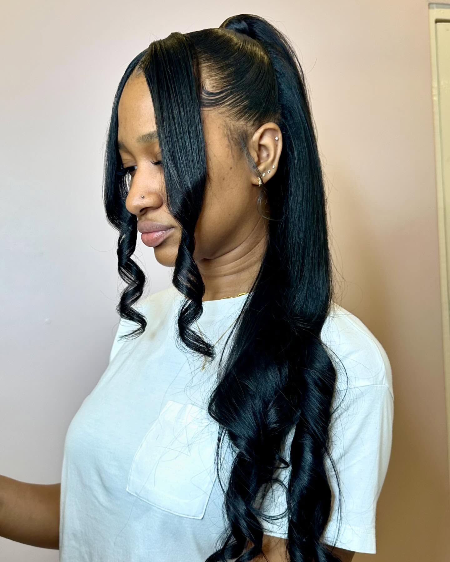 Ponytails with weaves are stunning – they add length and a brilliant shine. To keep that gloss, use hair oil and sleep with a silk bonnet or scarf. It keeps your long locks looking great, even if they aren’t technically yours.