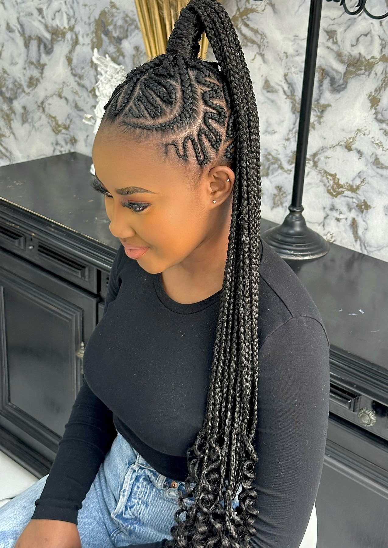 This unique hairstyle featuring extremely long braids and stitch cornrows is sure to turn heads! The highlight of this look is the intricate braided base wrapped around the ponytail itself.