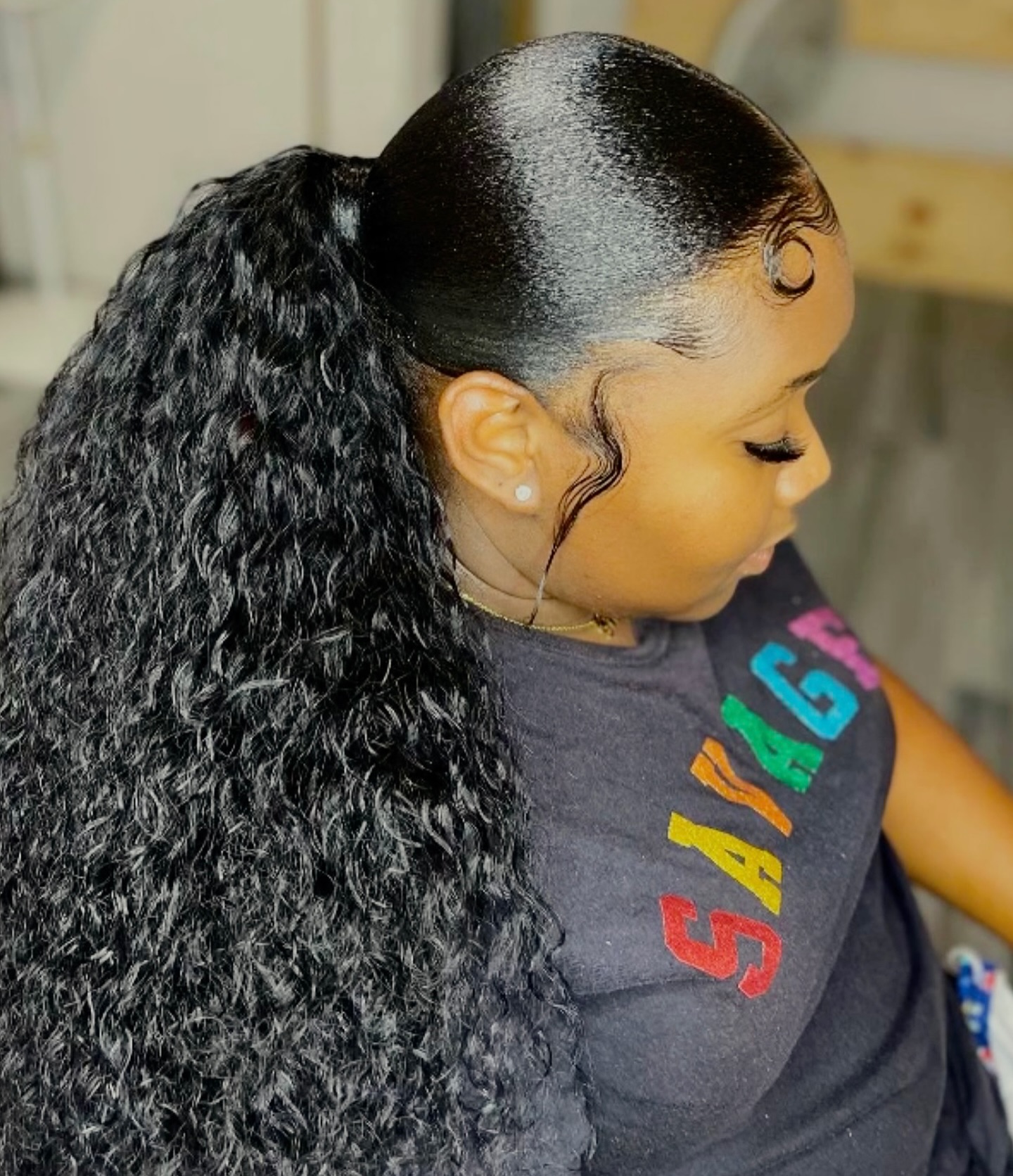 A combination of slicked-back hair with cute baby hairs and a voluminous curly low ponytail looks super creative. Shifting the ponytail to the side adds a touch of sophistication, making it an elevated choice for dressier occasions.