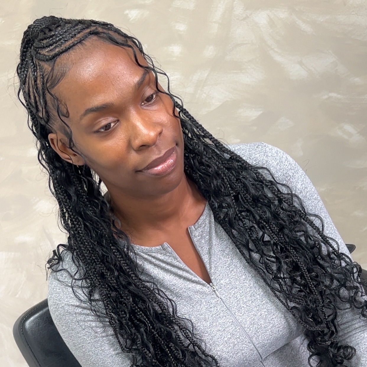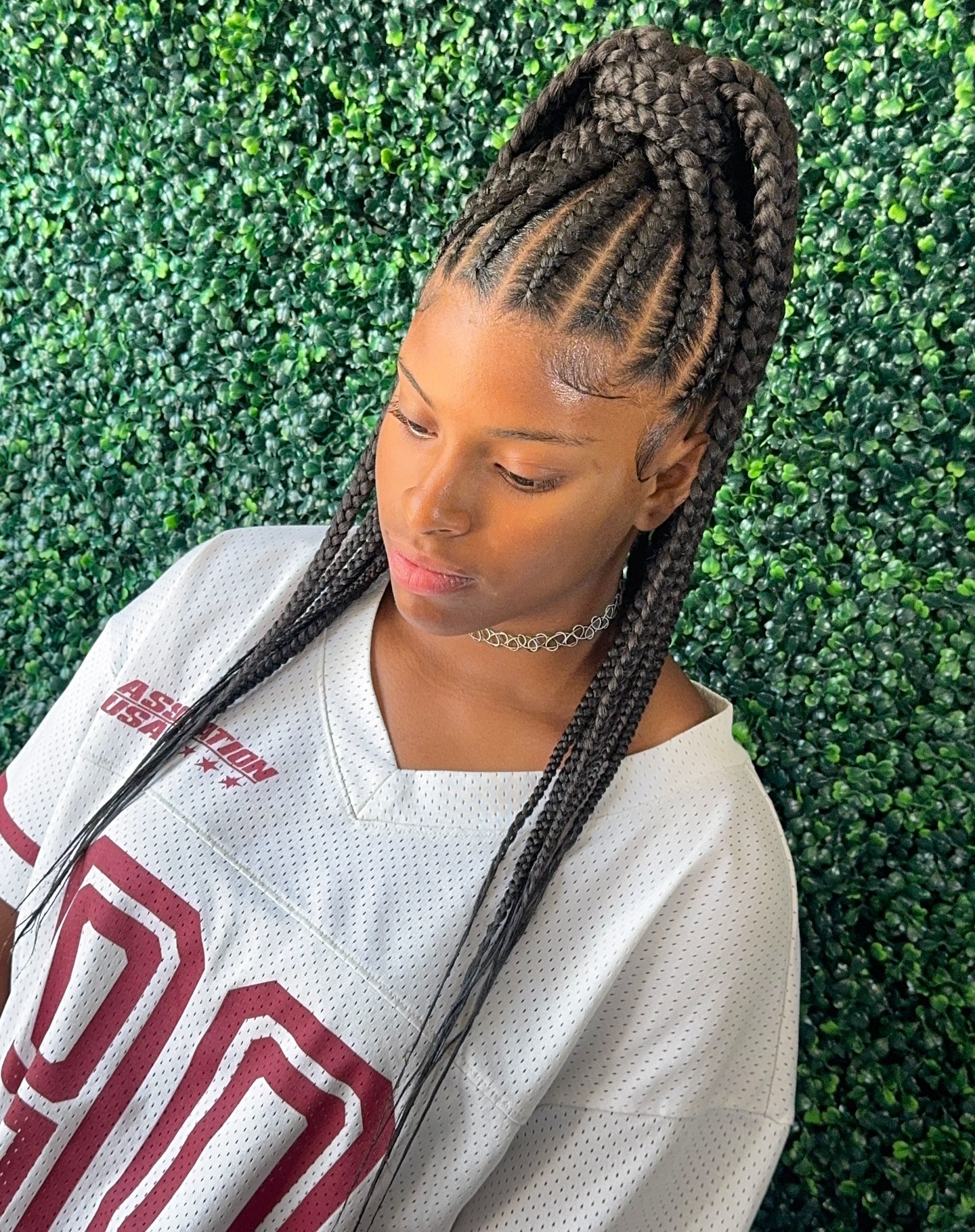Cornrows are a classic go-to for Black women aiming to get a stylish and low-maintenance look. You can make them your own with vibrant colors or a high ponytail, like in this gorgeous style with thin braids with curly ends.