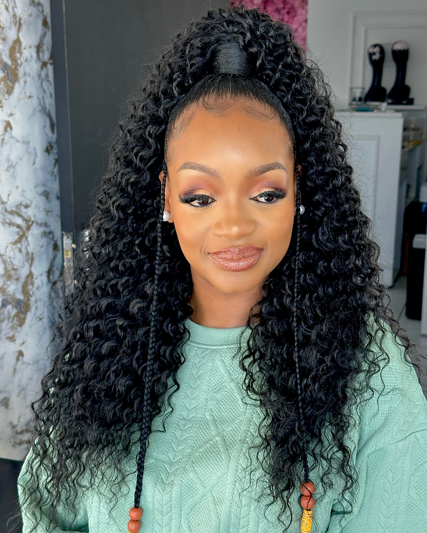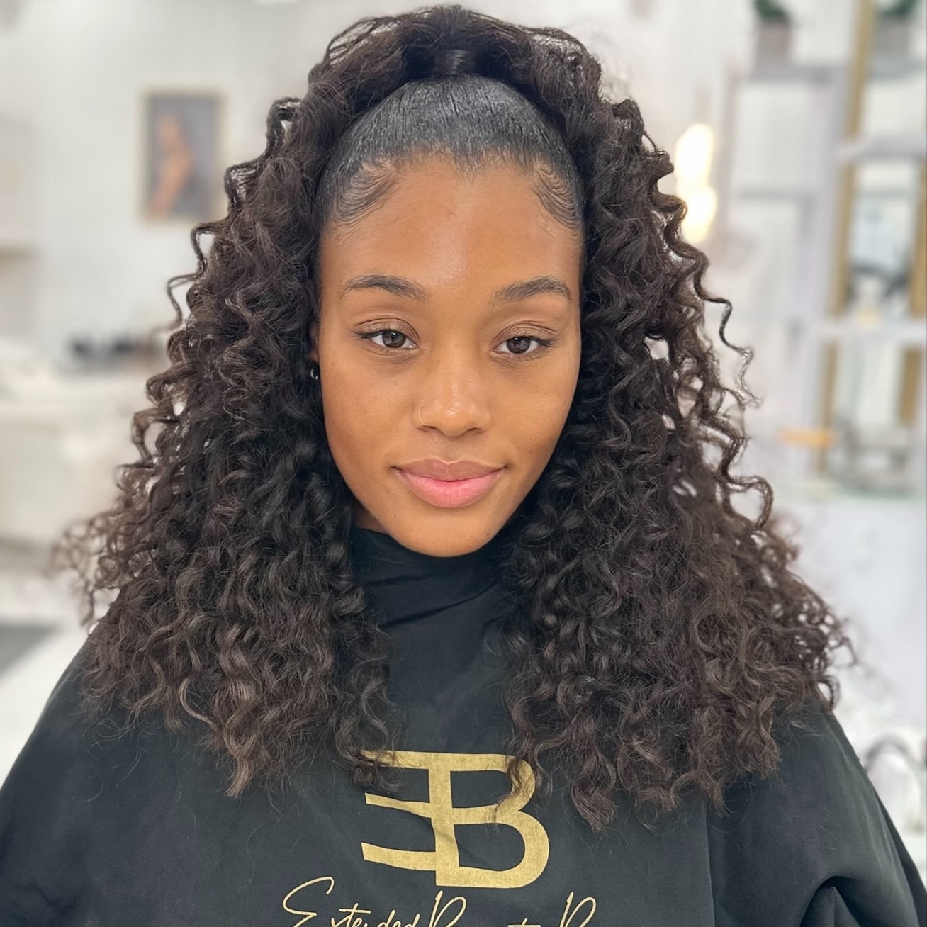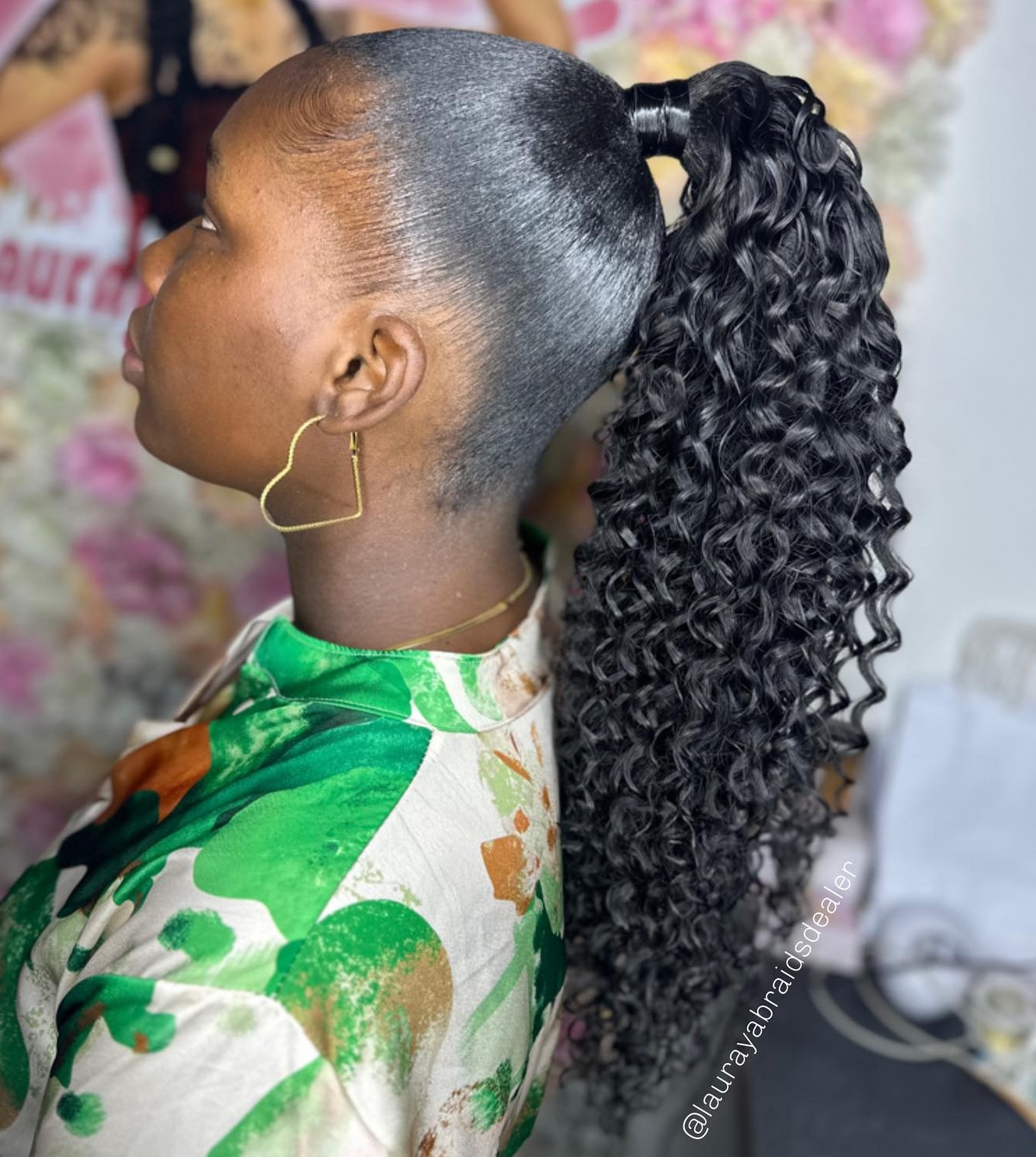 Voluminous spiral curls are stunning not only in long hairstyles but also in short chic ponytails. Wrap the base with curly ponytail extensions and complement the look with dramatic baby hair and vibrant jewelry.