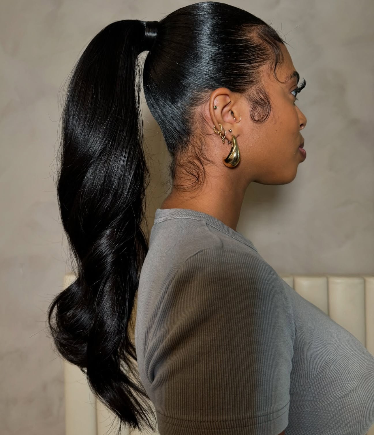 What a fun and extravagant hairstyle! Make yours unique by wearing it up high and adding a little curl to the ends for a retro vibe. Slick down your baby hairs to enhance the silkiness of the coif.