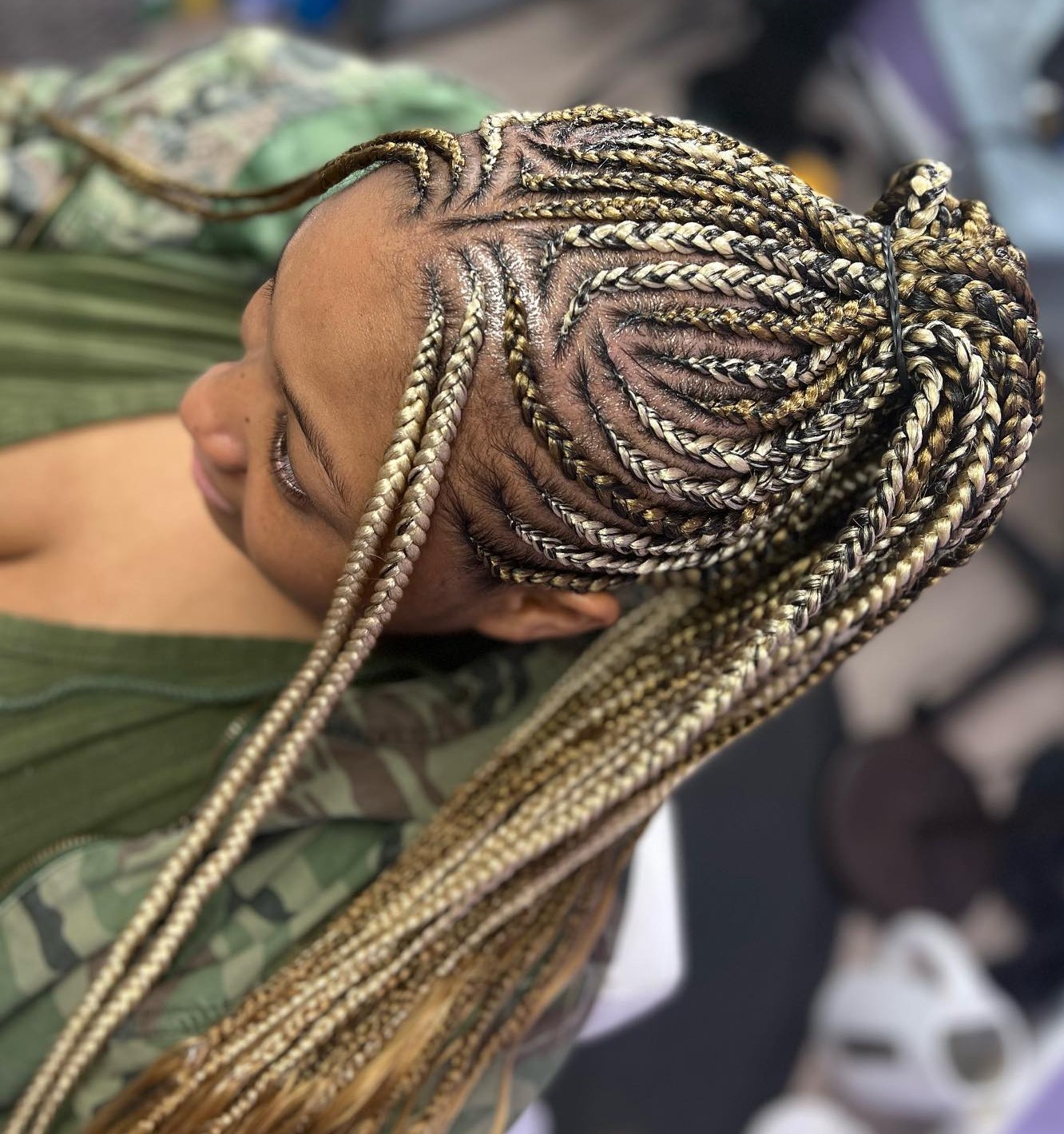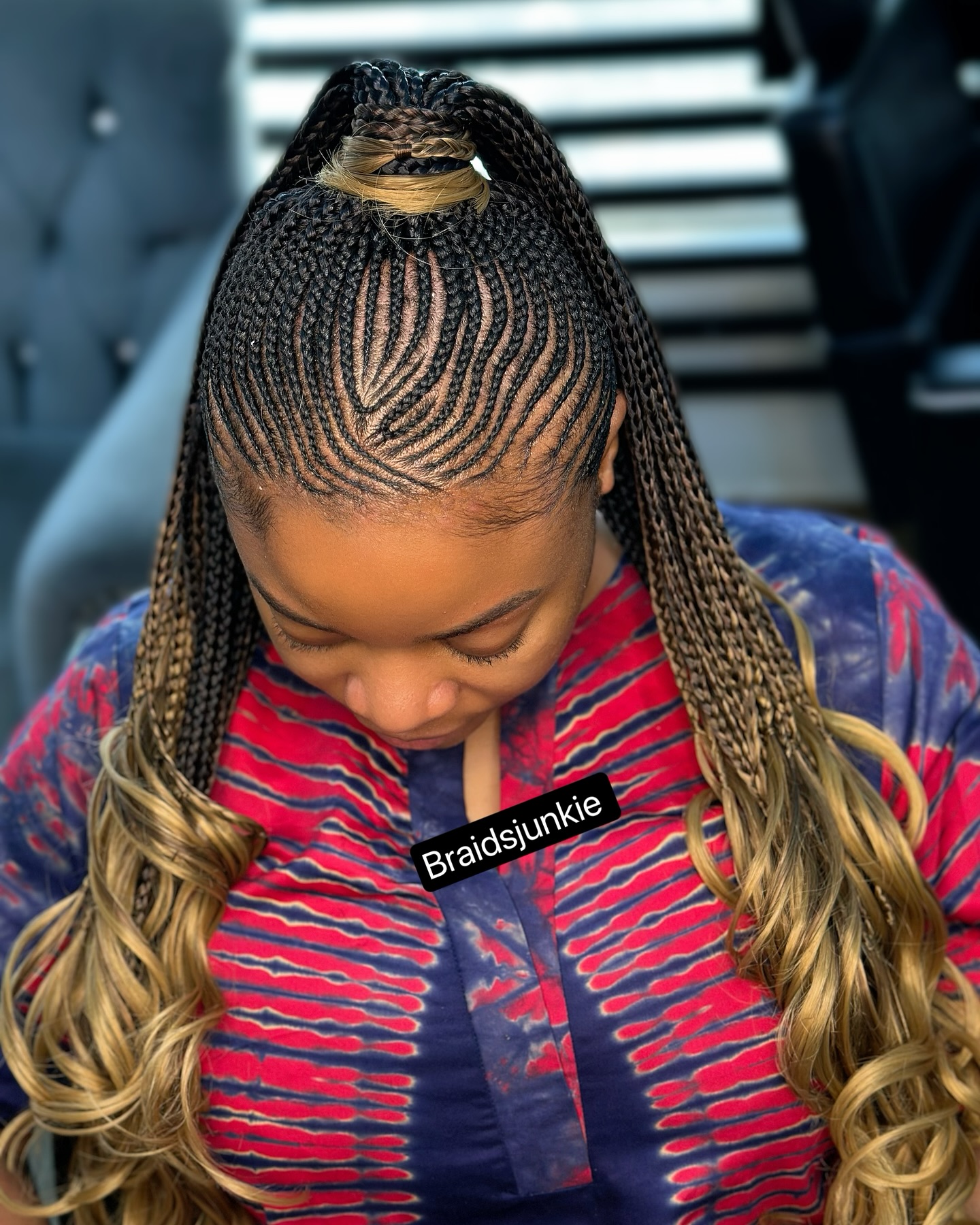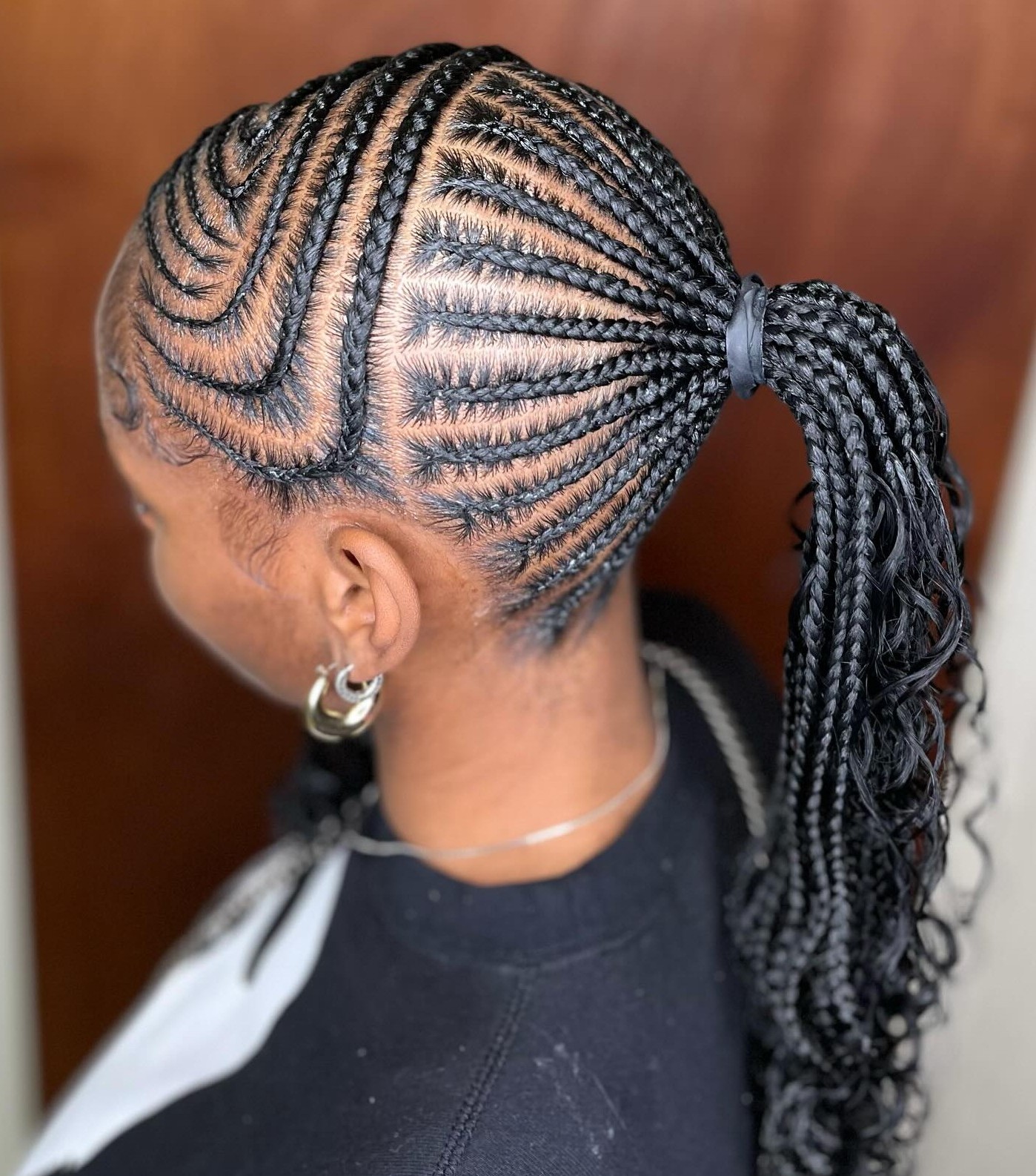 Cornrows are a classic go-to for Black women aiming to get a stylish and low-maintenance look. You can make them your own with vibrant colors or a high ponytail, like in this gorgeous style with thin braids with curly ends.