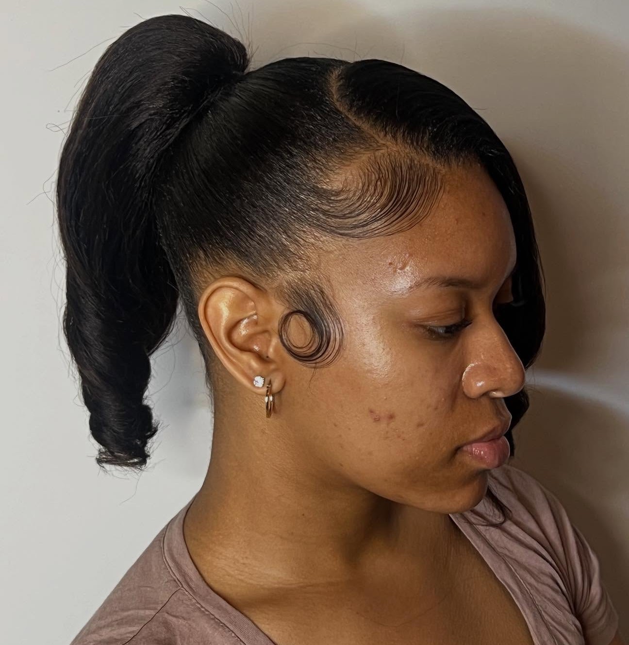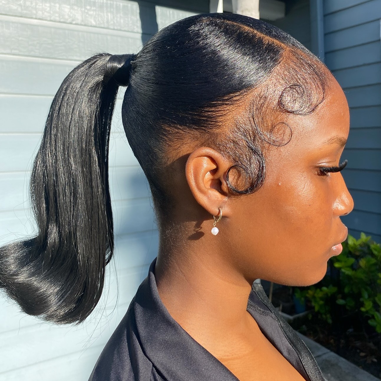 What a fun and extravagant hairstyle! Make yours unique by wearing it up high and adding a little curl to the ends for a retro vibe. Slick down your baby hairs to enhance the silkiness of the coif.