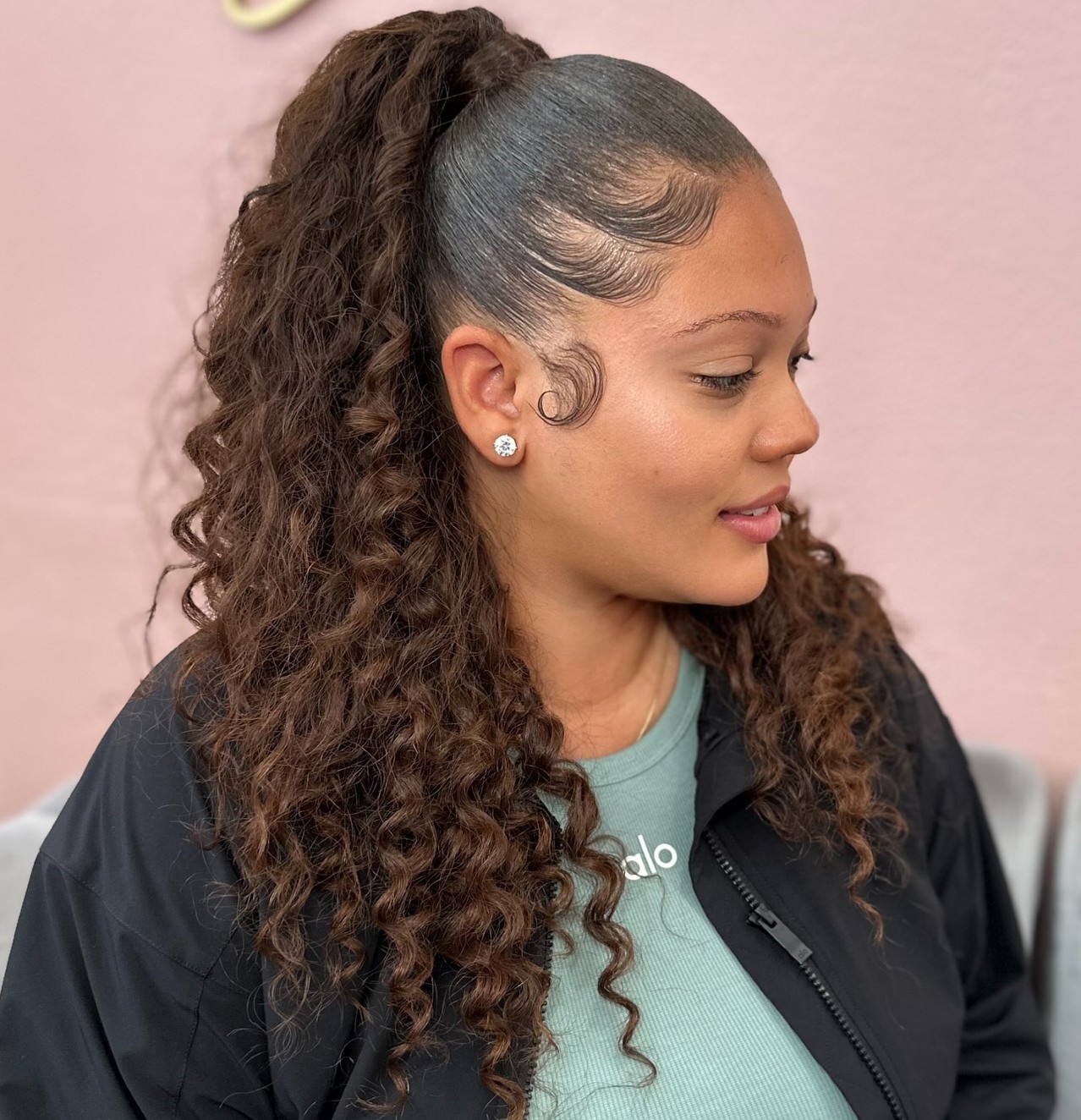 A combination of slicked-back hair with cute baby hairs and a voluminous curly low ponytail looks super creative. Shifting the ponytail to the side adds a touch of sophistication, making it an elevated choice for dressier occasions.