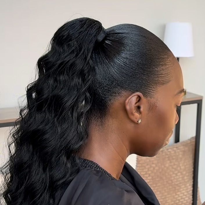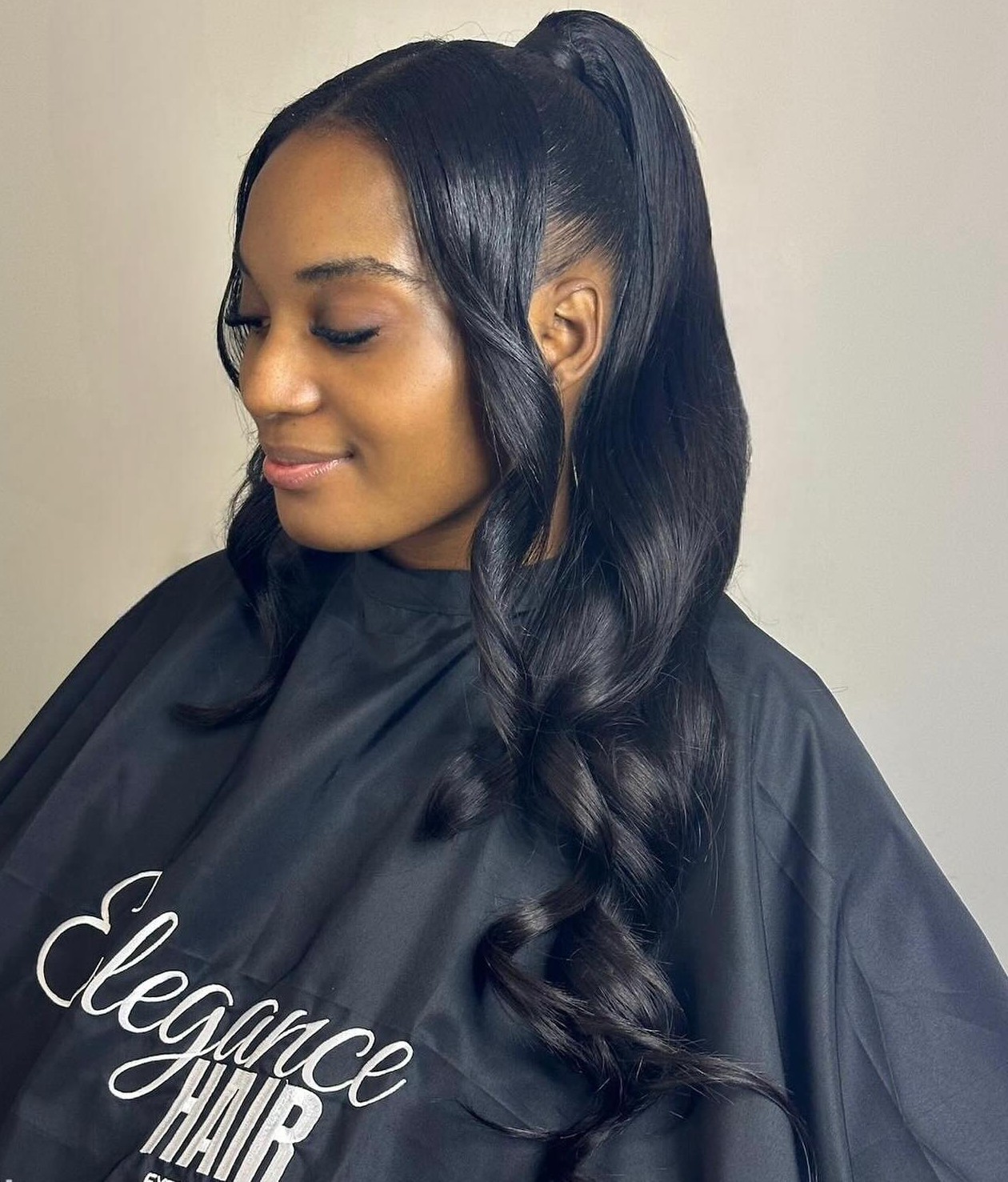Ponytails with weaves are stunning – they add length and a brilliant shine. To keep that gloss, use hair oil and sleep with a silk bonnet or scarf. It keeps your long locks looking great, even if they aren’t technically yours.