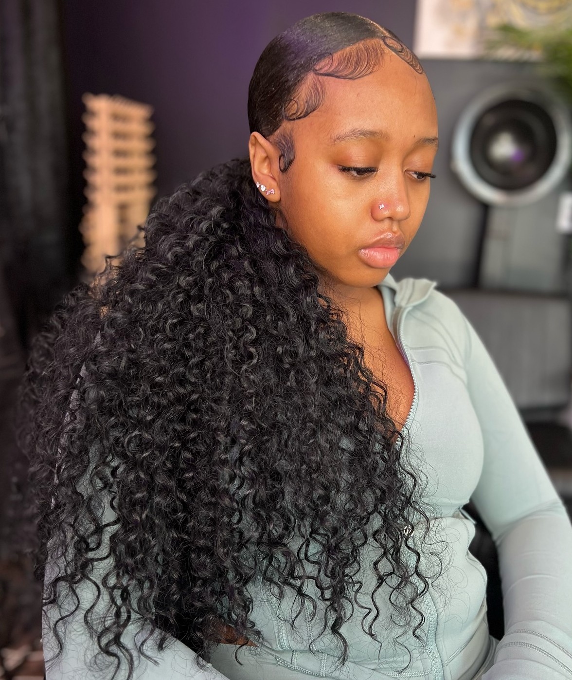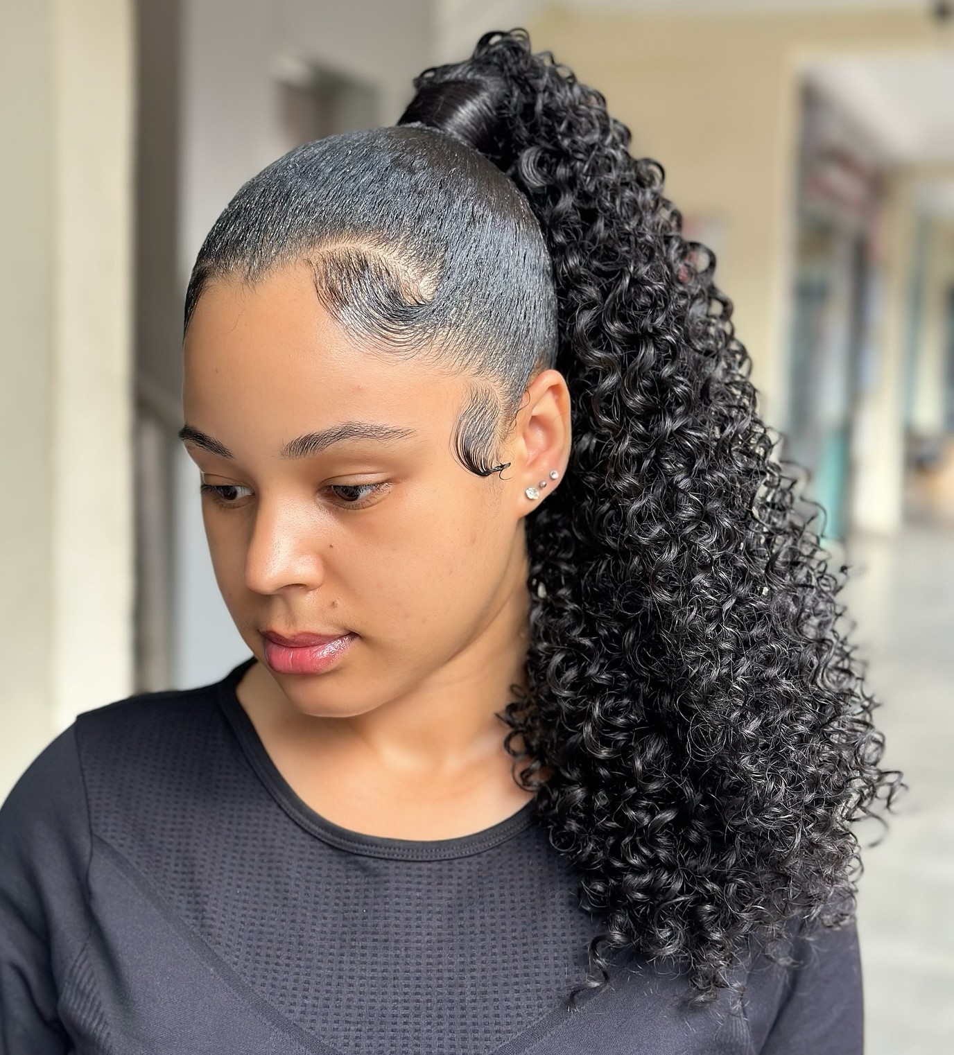 A combination of slicked-back hair with cute baby hairs and a voluminous curly low ponytail looks super creative. Shifting the ponytail to the side adds a touch of sophistication, making it an elevated choice for dressier occasions.