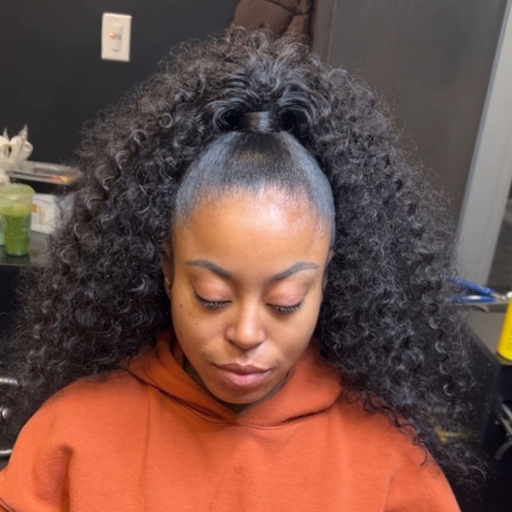 Voluminous spiral curls are stunning not only in long hairstyles but also in short chic ponytails. Wrap the base with curly ponytail extensions and complement the look with dramatic baby hair and vibrant jewelry.