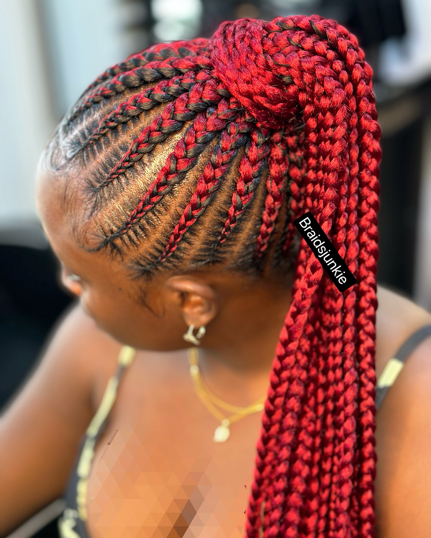 This unique hairstyle featuring extremely long braids and stitch cornrows is sure to turn heads! The highlight of this look is the intricate braided base wrapped around the ponytail itself.