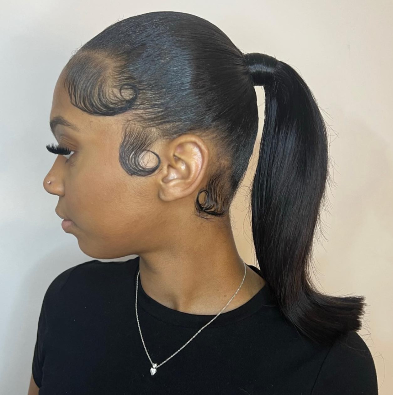 What a fun and extravagant hairstyle! Make yours unique by wearing it up high and adding a little curl to the ends for a retro vibe. Slick down your baby hairs to enhance the silkiness of the coif.