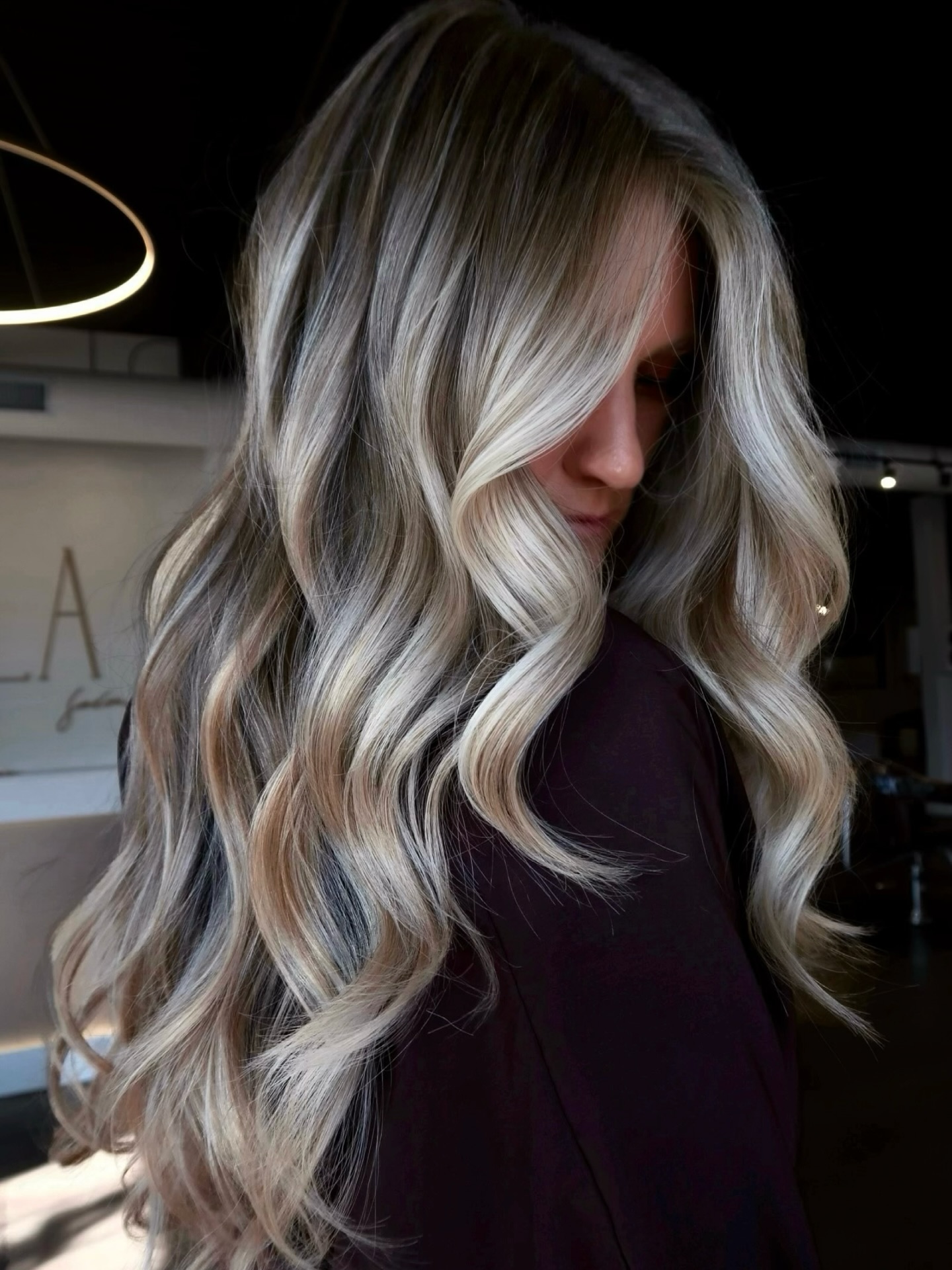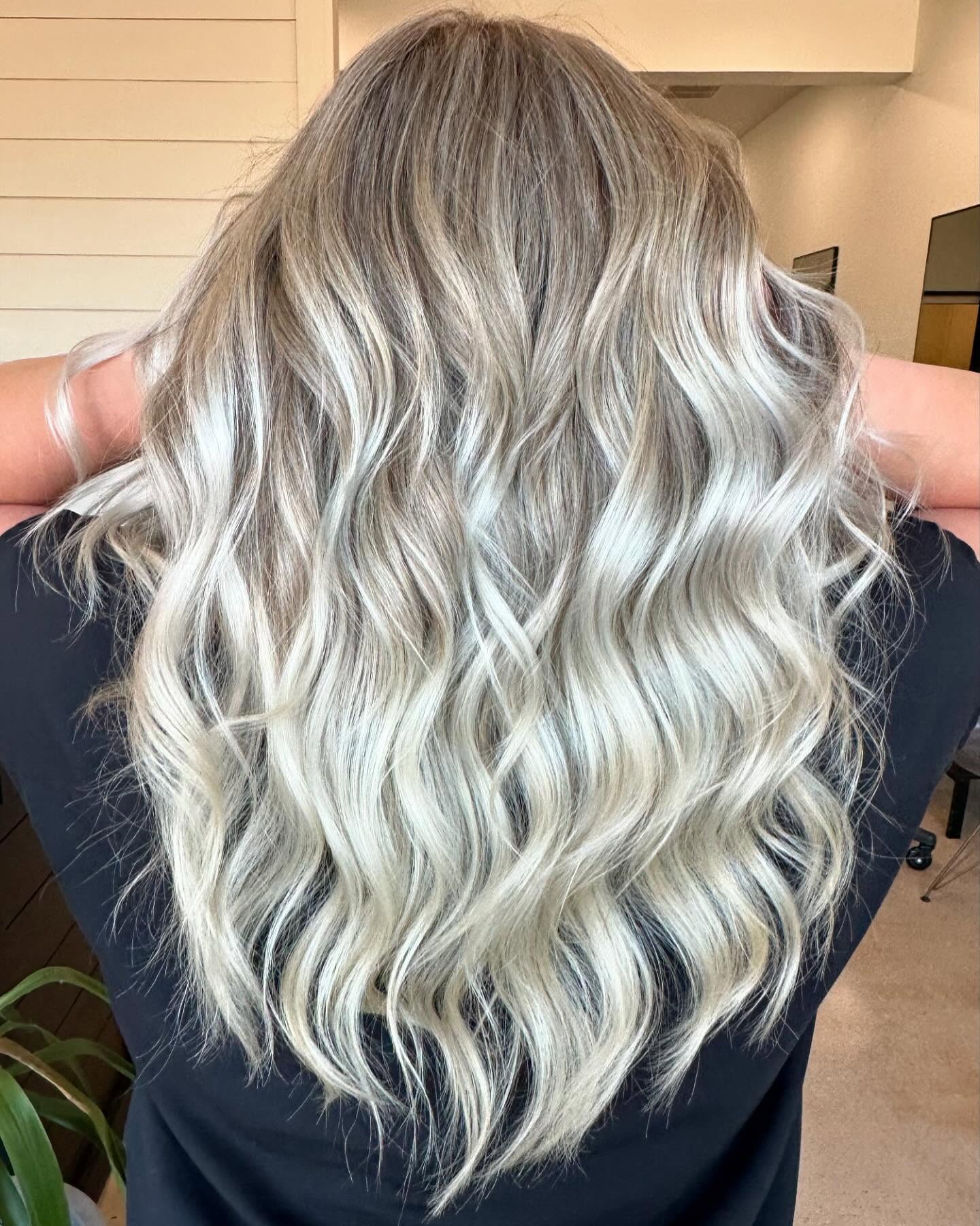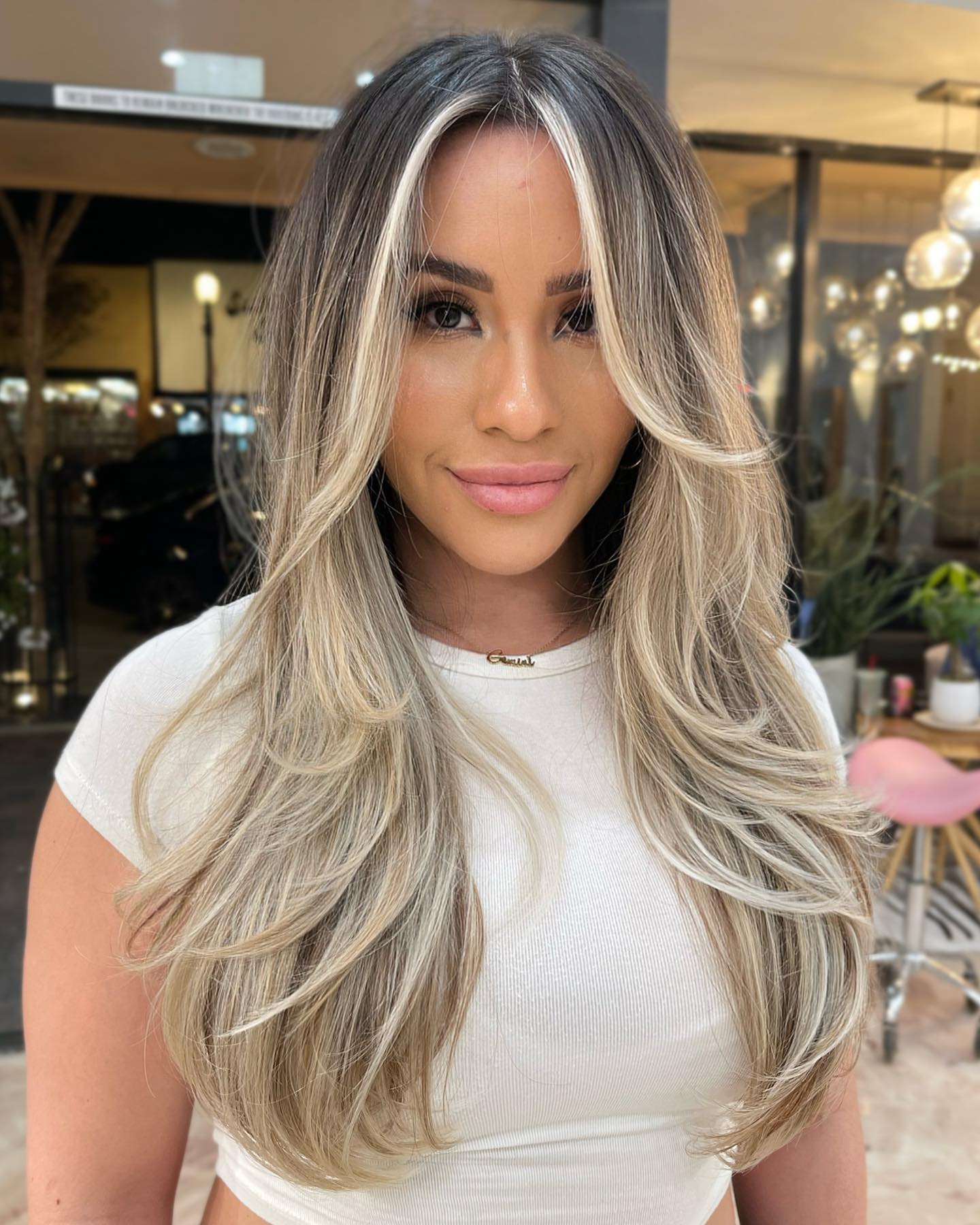 This balayage hair is cool in more ways than one, from its ashen color to the contemporary cut. The soft long layers lend themselves to easy maintenance; flyaways only enhance the effortless appeal, and frizz accentuates the volume. It’s a can’t-miss coif.