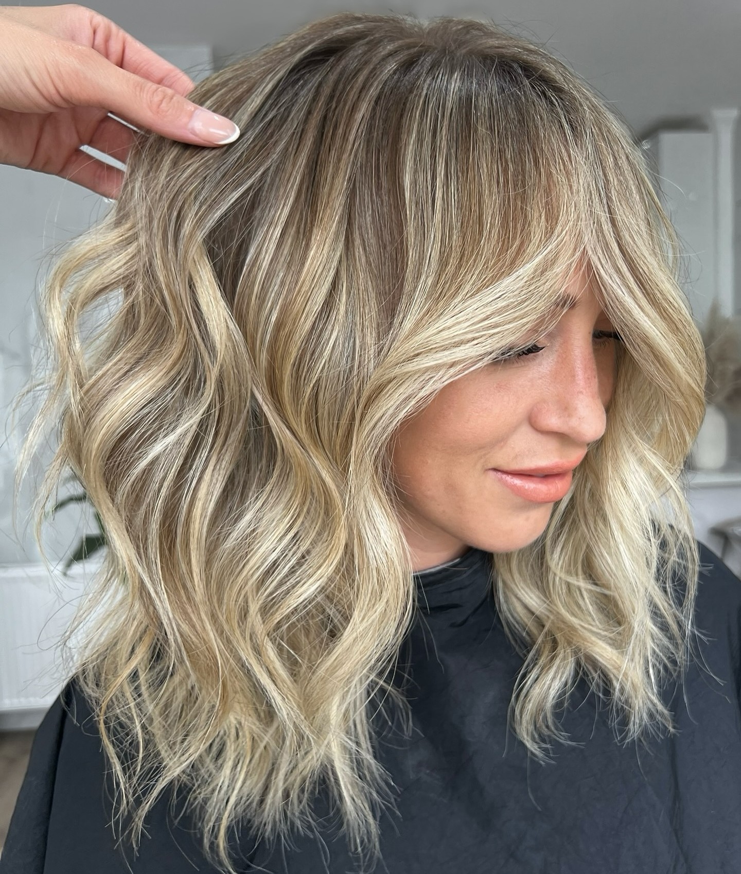 A warm, golden hue makes this curled style the ideal complement to darker complexions. Because it’s such a versatile style, no one can resist balayage. Blonde comes in all different hues, so it’s easy to find a shade that goes well with your skin tone whether it is an ashen color or something deliciously golden.