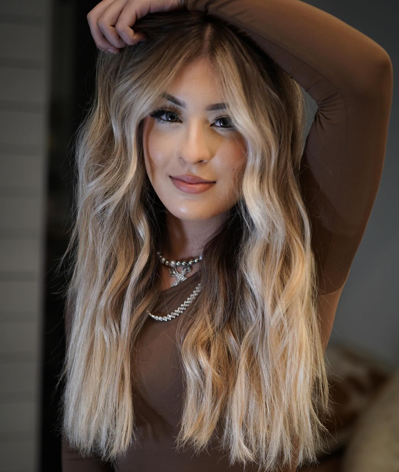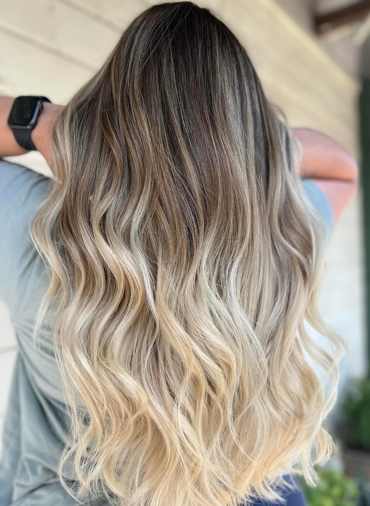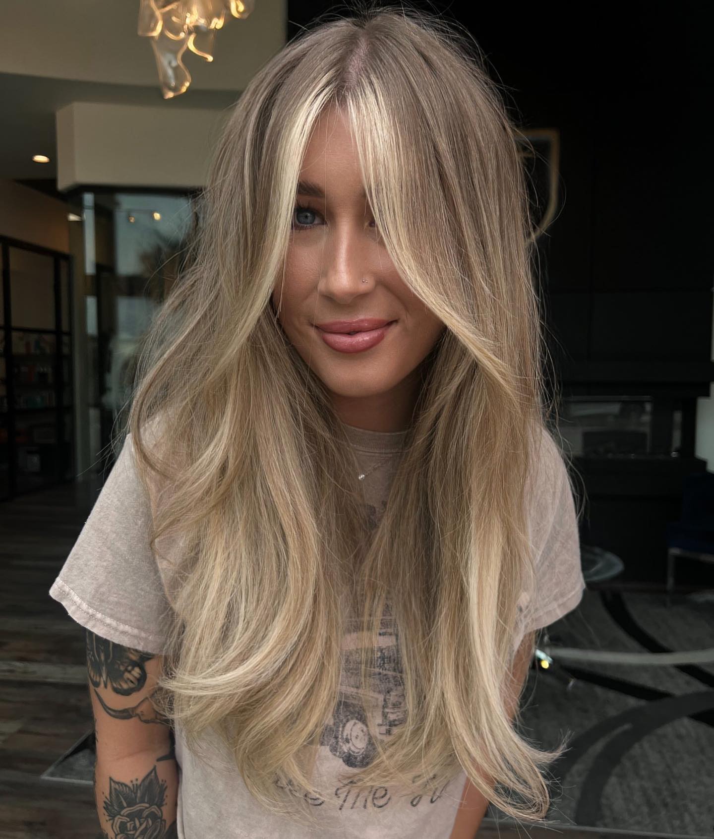 This balayage hair is cool in more ways than one, from its ashen color to the contemporary cut. The soft long layers lend themselves to easy maintenance; flyaways only enhance the effortless appeal, and frizz accentuates the volume. It’s a can’t-miss coif.