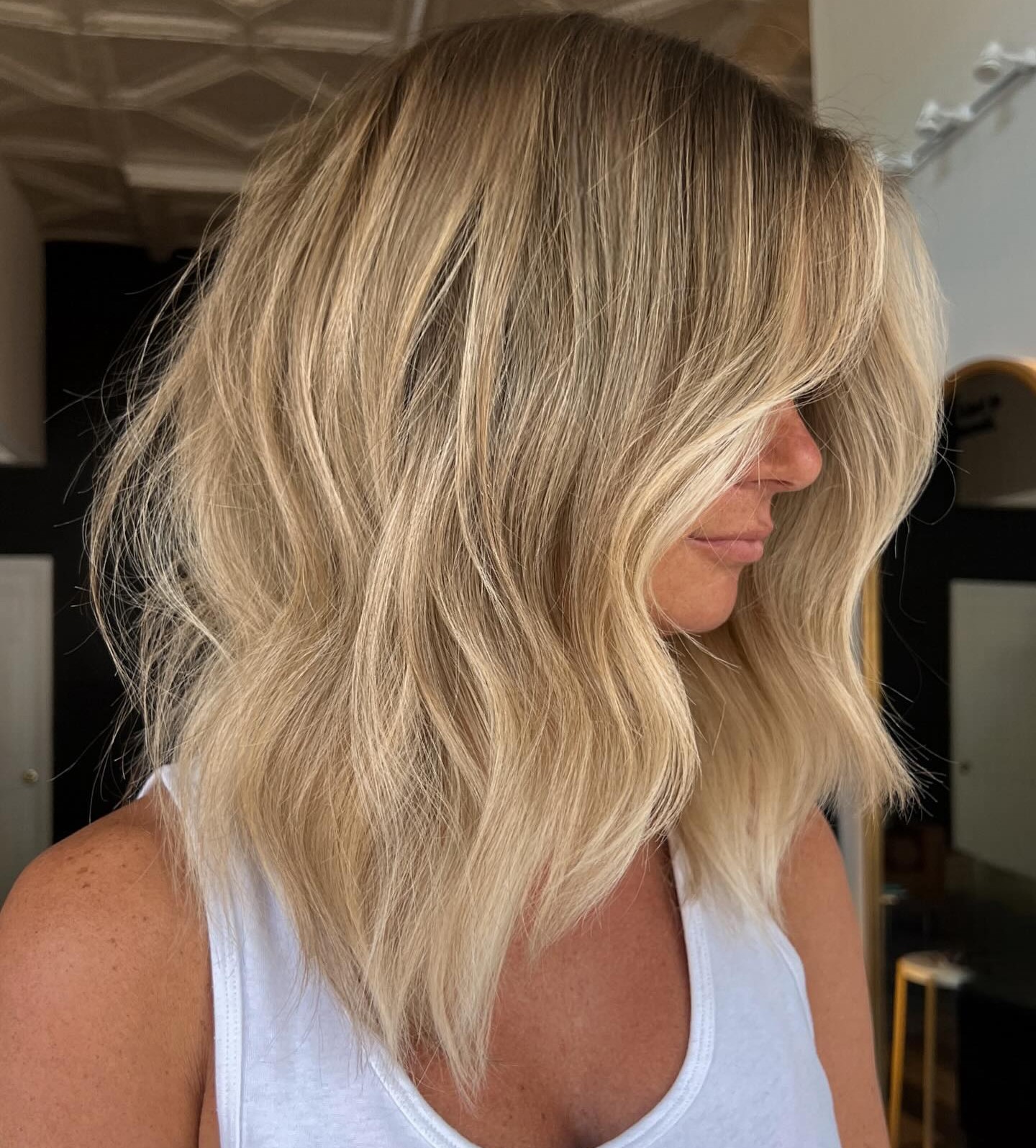 A warm, golden hue makes this curled style the ideal complement to darker complexions. Because it’s such a versatile style, no one can resist balayage. Blonde comes in all different hues, so it’s easy to find a shade that goes well with your skin tone whether it is an ashen color or something deliciously golden.