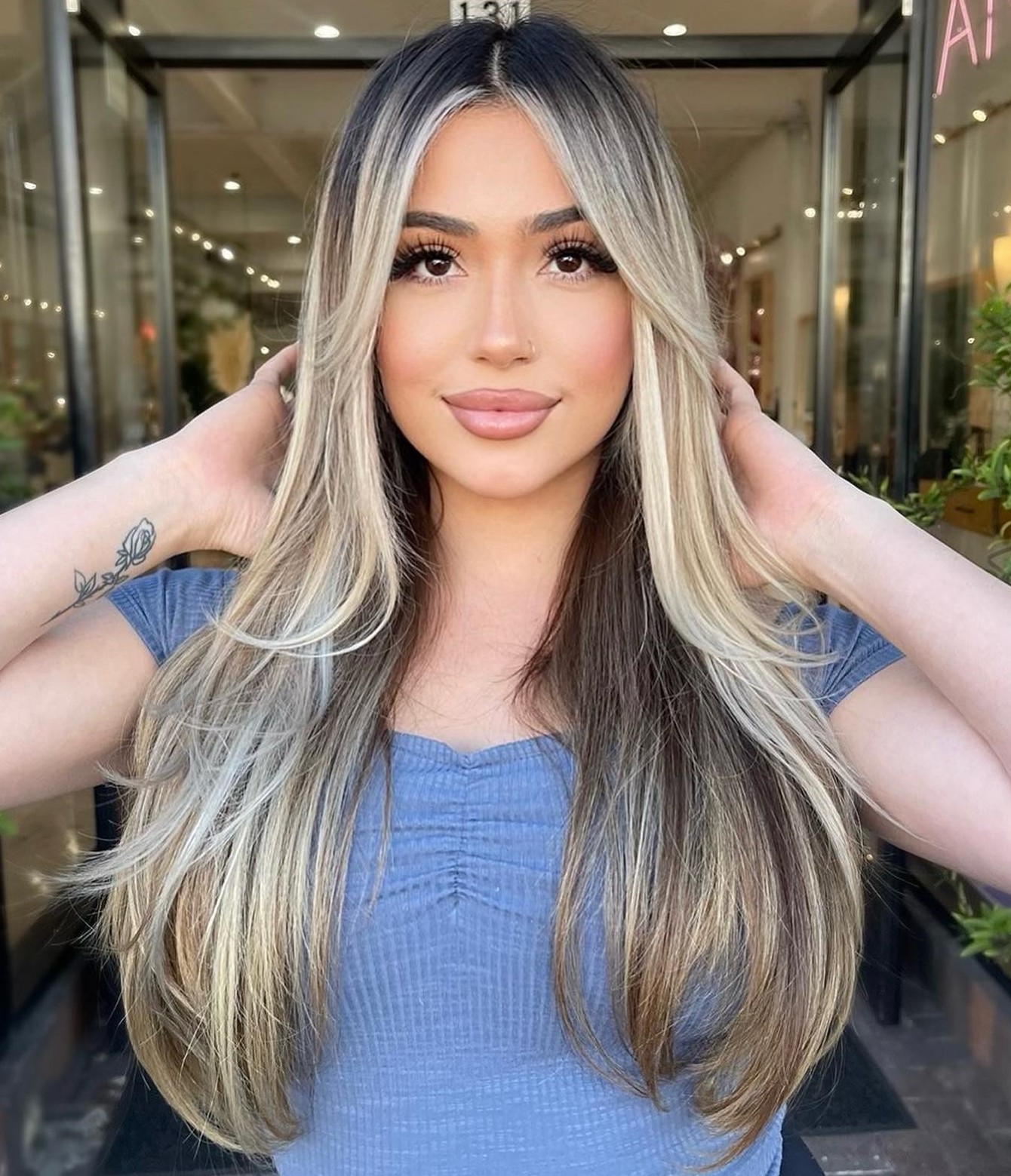Teens and twentysomethings can wear their hair long and straight beautifully. Try hand-painting highlights that takes advantage of length and texture, like this one with the rounded, darkened top and lighter middle and ends.