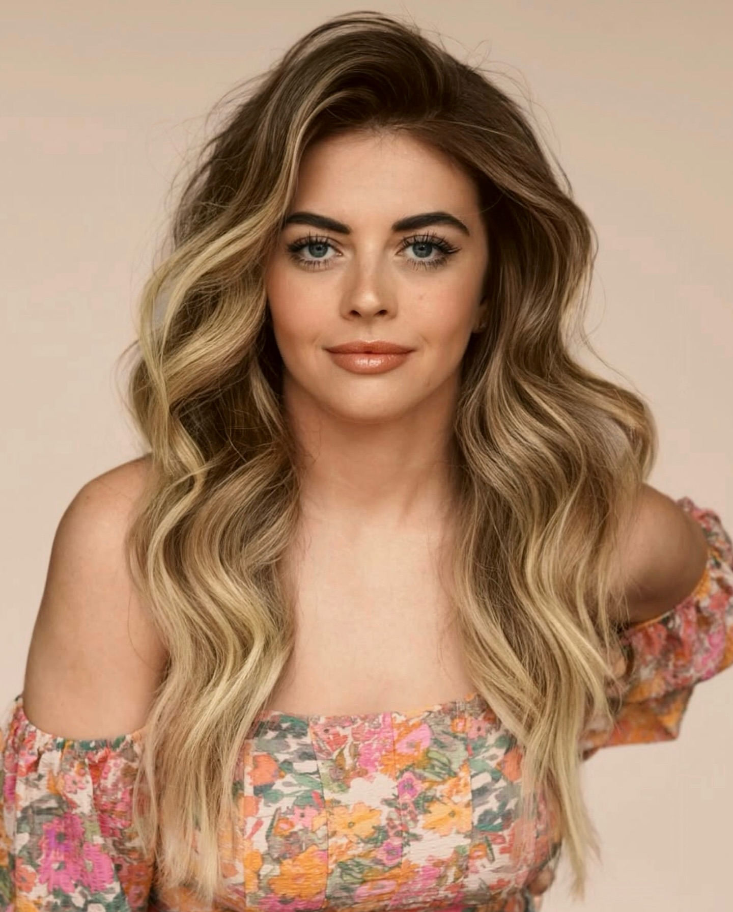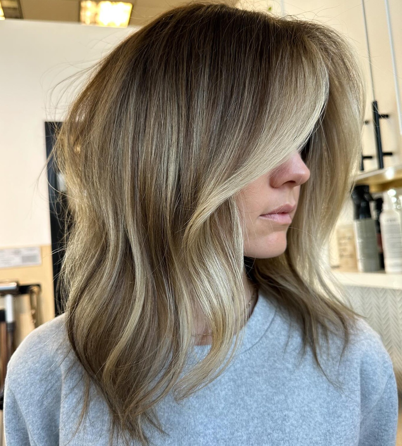 Can’t decide between brown and blonde? A bronde balayage is a good way to try out both choices without sacrificing your natural hue. Choppy layers and messy waves add a little ease to the look.