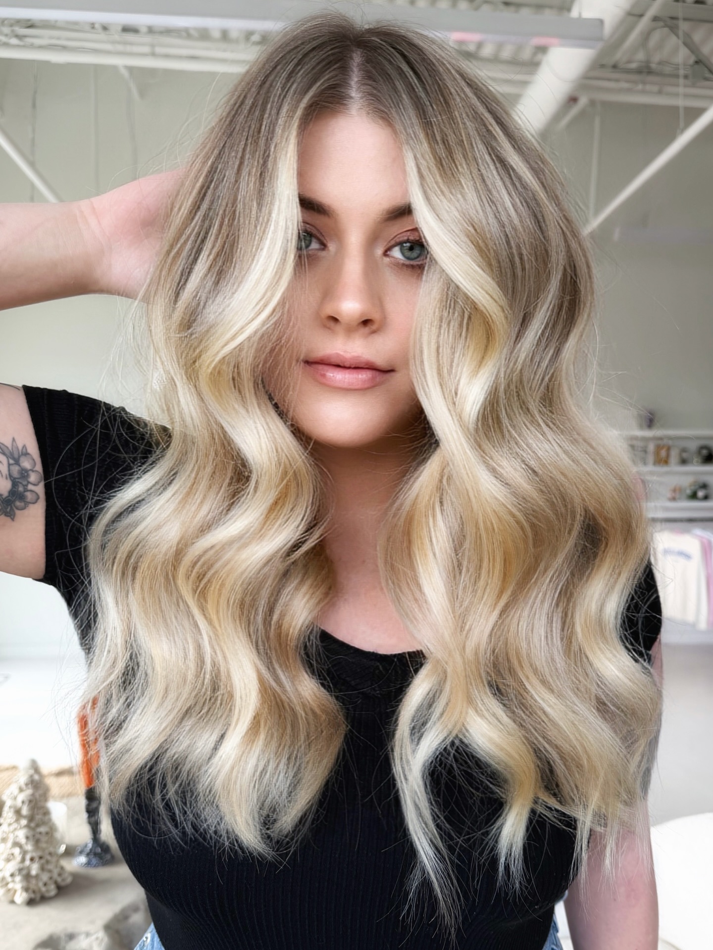 A hue that’s as rich as honey blonde can make your balayage equal parts sweet and sexy. The soft, delicious color is a perfect match for waist-length, bouncy curls. Recreate your stylists work at home with a 1.5” curling iron or try the classic, tried-and-true method of sleeping in rollers.