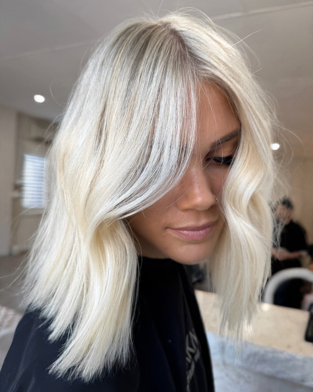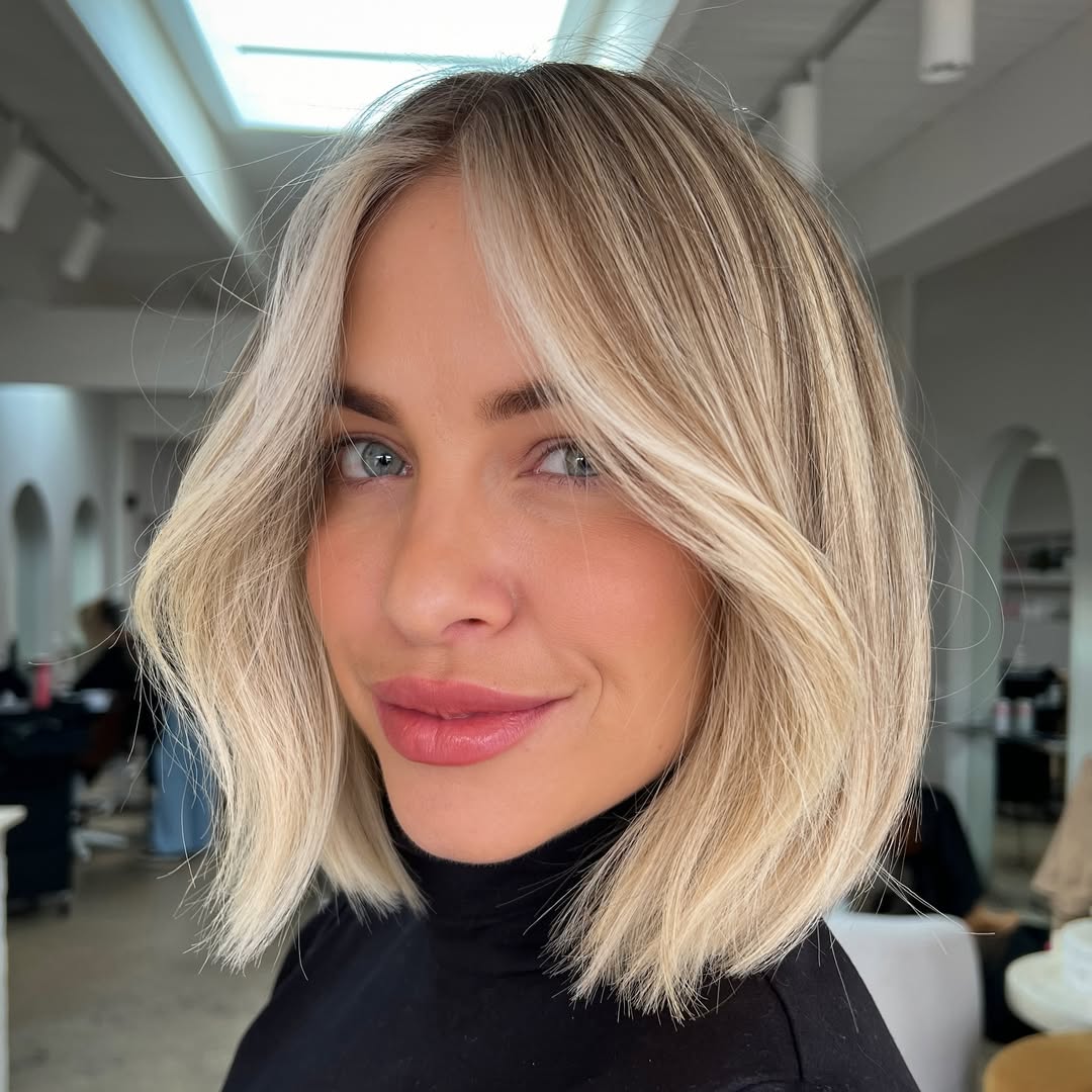 Show off the shape of your cool lob cut with well-blended face-framing streaks. The short style enables you to use the power of trendy blonde hair highlights to draw attention to your face. Here, the bright blonde hair immediately directs you to the wearer’s eyes.