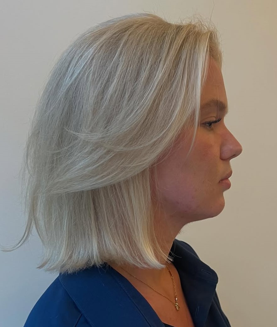 This poker straight blonde lob is so neat that it looks almost futuristic. A simple cut and a sophisticated color make a refined look. Coordinate the cut and the color with your skin tone and face shape to find your best bet.