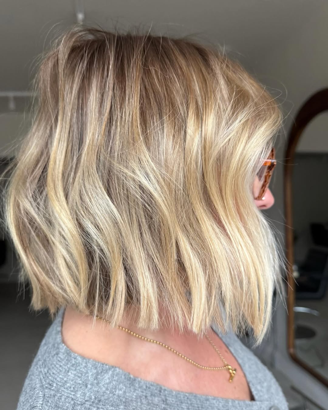 A bright sandy blonde hair color sets the stage for this medium-length crop, finished off with a sleek side part. There is also a combination of highlights and lowlights to give the hair more depth and definition.