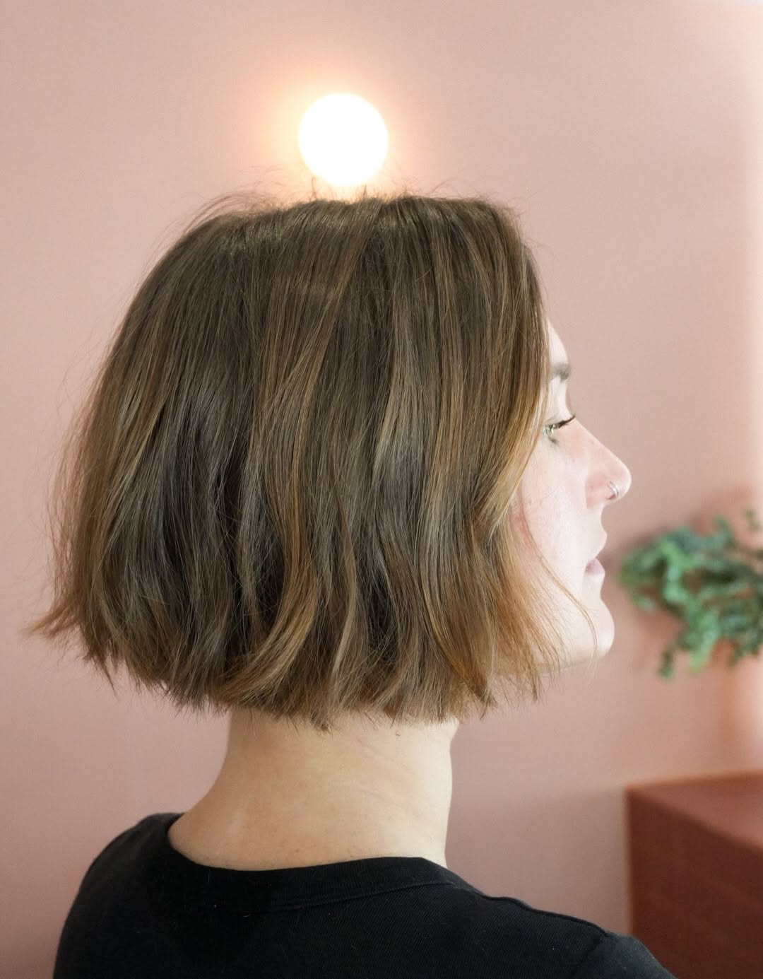 If you’re a fan of natural colors and short haircuts, you will like this voluminous, neck-length style with a natural texture. The trick is to build some weight in the crown with a subtle graduation. The added texture will also create density and volume around the top.