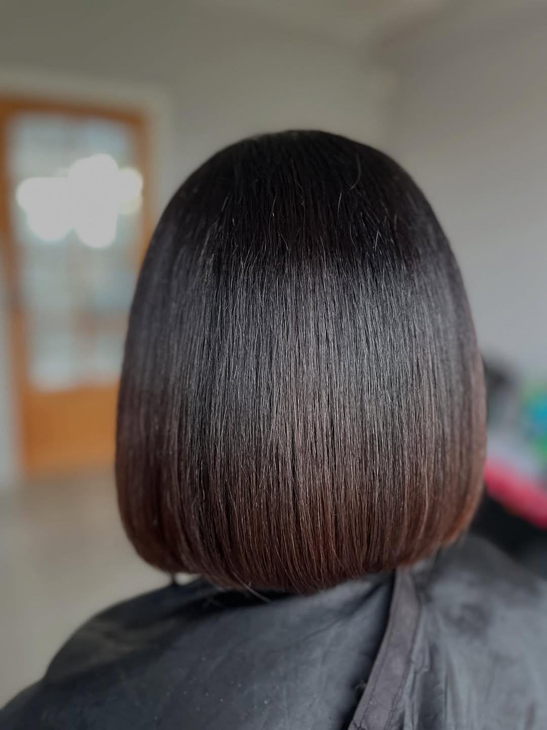 If you want your natural hair to look chic and trendy, pay attention to this elegant blunt bob hairstyle. Such sharp, straight cuts suit round, heart-shaped, and oval faces. Besides, a neat straight edge is perfect for thin hair, as it creates an illusion of a more voluminous look.