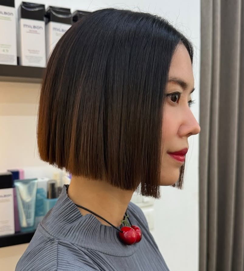 A blunt bob with pointed tips frames the face beautifully, especially if its shape is a square or inverted triangle. The short back presents a notable contrast with the front section, creating an elevated look.