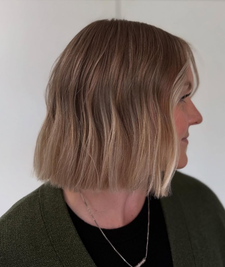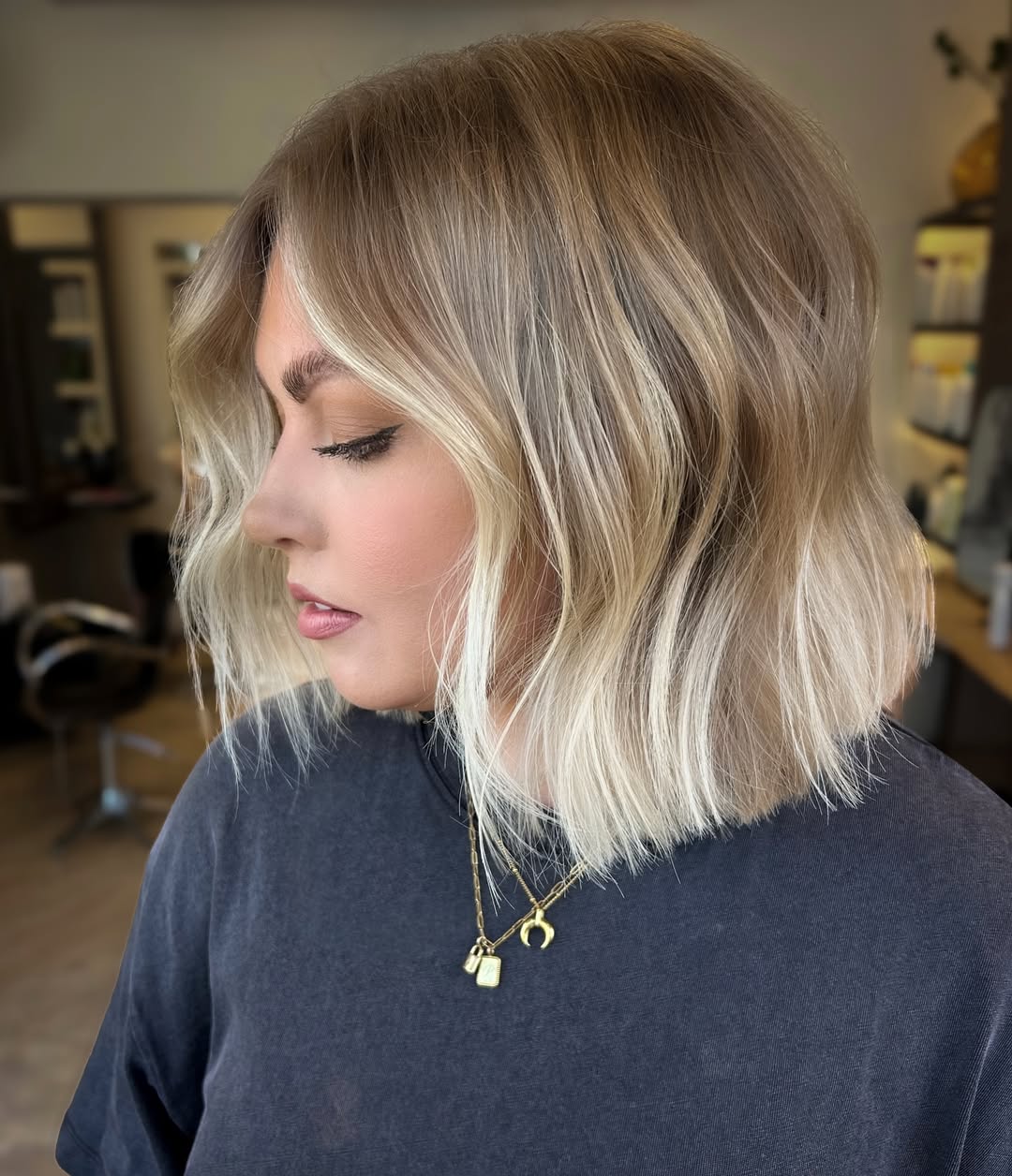 So modern, yet so simple. This cut allows for the ease of balayage strands to fall as they may. The pretty sun-kissed blonde color is easy to maintain. Introduce some texture with a dab of styling product, and you are ready to shine with a new hairdo.
