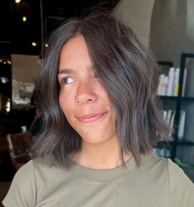 The rich chocolate brown shade is what initially draws your attention to this look, however, the standout cut with choppy ends is what makes it unforgettable. Styled with a side part and subtle highlights, this shoulder-length hairdo can be adapted for many hair types.