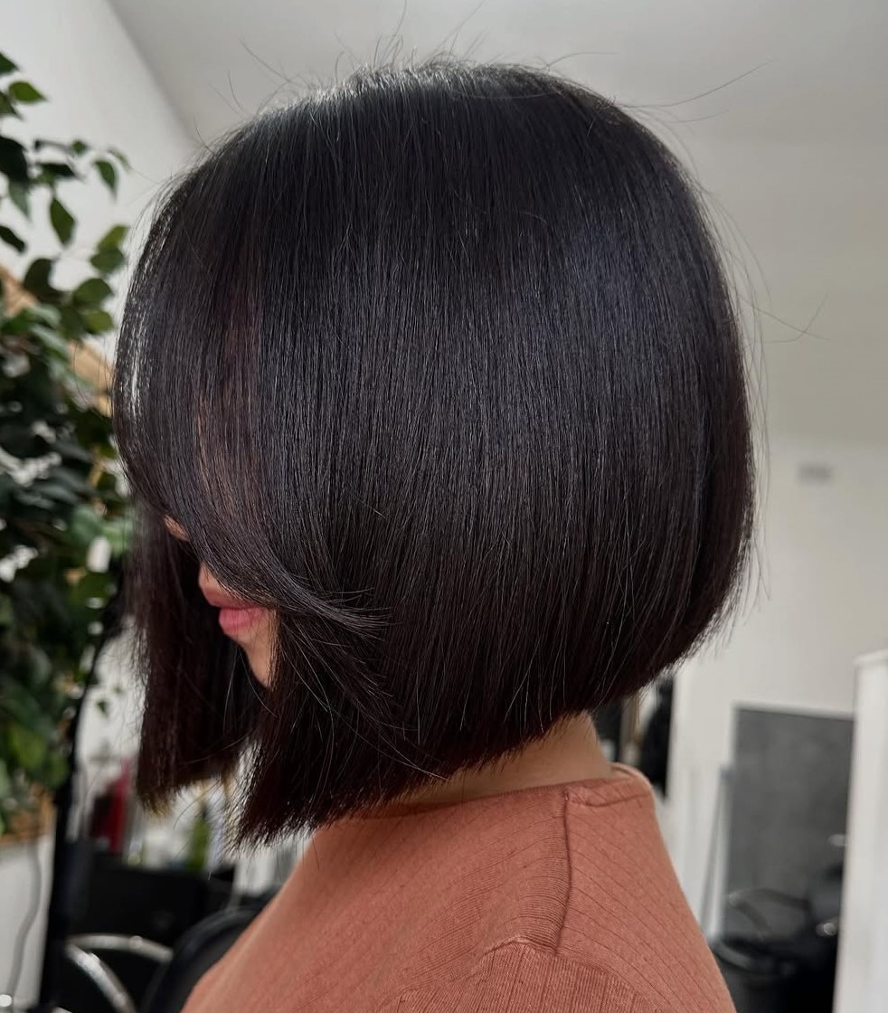 Here, you have a chic cut with asymmetry, angled to perfection, and finished off with a side part that allows the hair to fall mysteriously over one eye. As a result, you get a polished style, with not a strand out of place.