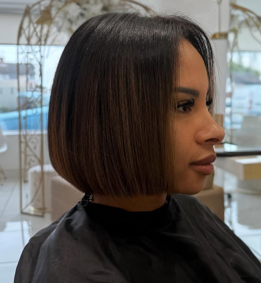If you want your natural hair to look chic and trendy, pay attention to this elegant blunt bob hairstyle. Such sharp, straight cuts suit round, heart-shaped, and oval faces. Besides, a neat straight edge is perfect for thin hair, as it creates an illusion of a more voluminous look.