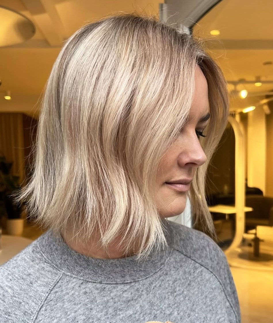 A bright sandy blonde hair color sets the stage for this medium-length crop, finished off with a sleek side part. There is also a combination of highlights and lowlights to give the hair more depth and definition.