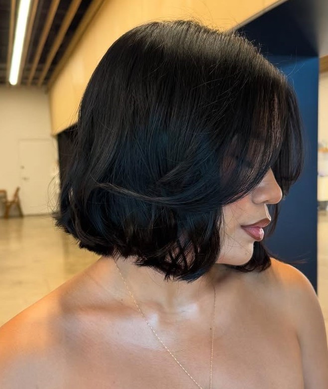 Here, you have a chic cut with asymmetry, angled to perfection, and finished off with a side part that allows the hair to fall mysteriously over one eye. As a result, you get a polished style, with not a strand out of place.