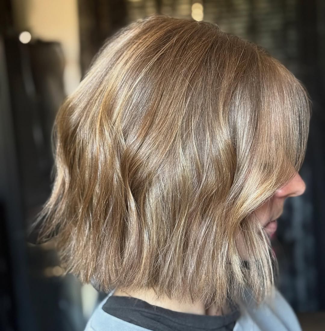 So modern, yet so simple. This cut allows for the ease of balayage strands to fall as they may. The pretty sun-kissed blonde color is easy to maintain. Introduce some texture with a dab of styling product, and you are ready to shine with a new hairdo.