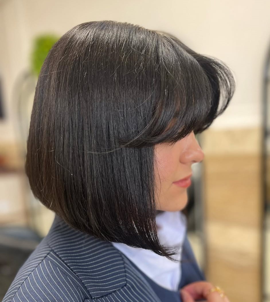 Here, you have a chic cut with asymmetry, angled to perfection, and finished off with a side part that allows the hair to fall mysteriously over one eye. As a result, you get a polished style, with not a strand out of place.