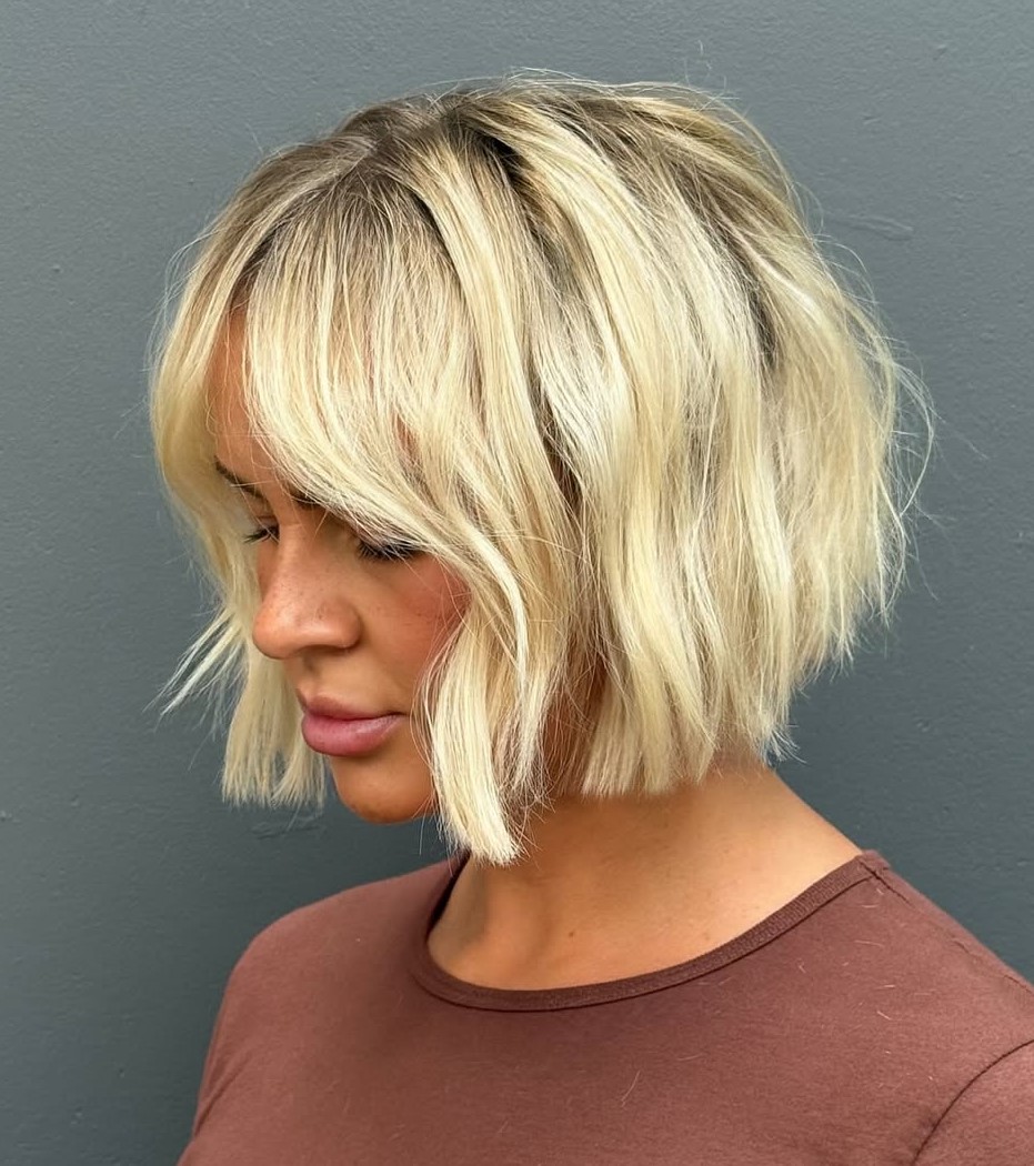 Suitable for all occasions, the hairdo offers a striking blend of a casual crop and well-trimmed bangs. It’s ideal for those fine-haired ladies looking for a simple style with a voluminous texture.