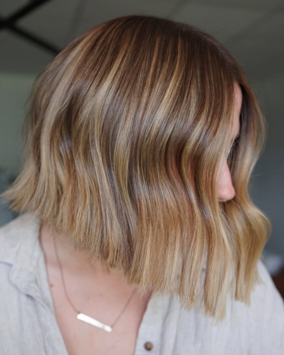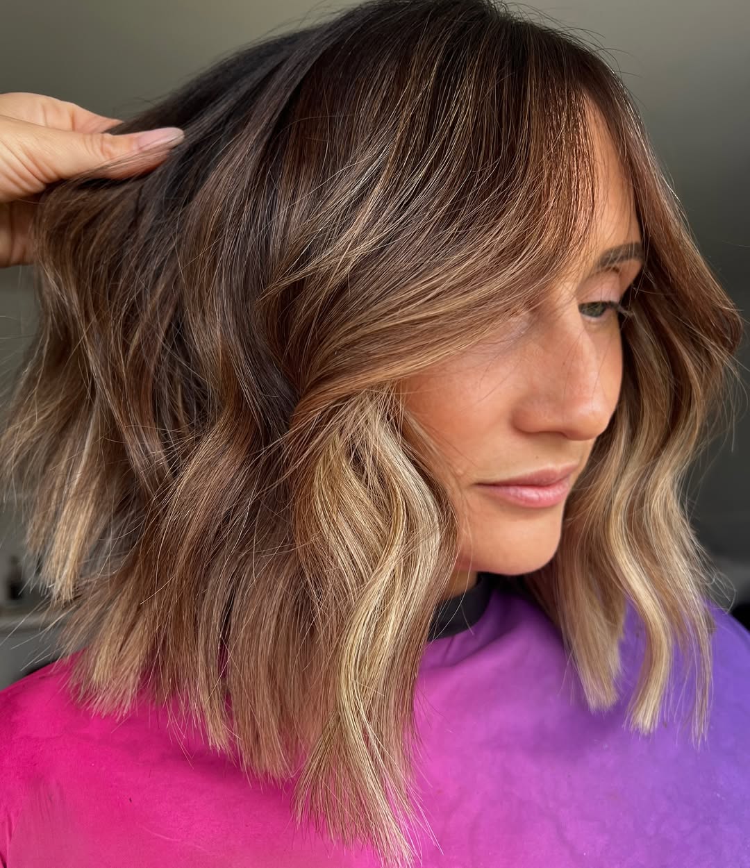 This trim is styled to appear softer and more romantic. If you like extra volume, add some soft, textured waves throughout the length. Paired with a warm brown balayage, the haircut looks stylish and elegant.