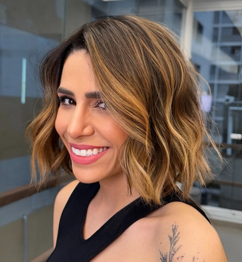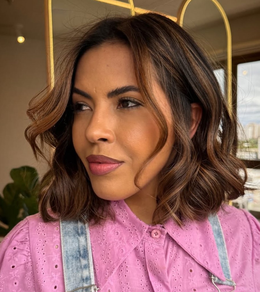 This wavy medium-length style is punctuated with flattering caramel highlights that are sprinkled through the undone waves to boost texture. With a touch of hairspray, you can achieve a lasting effect and maximum volume.