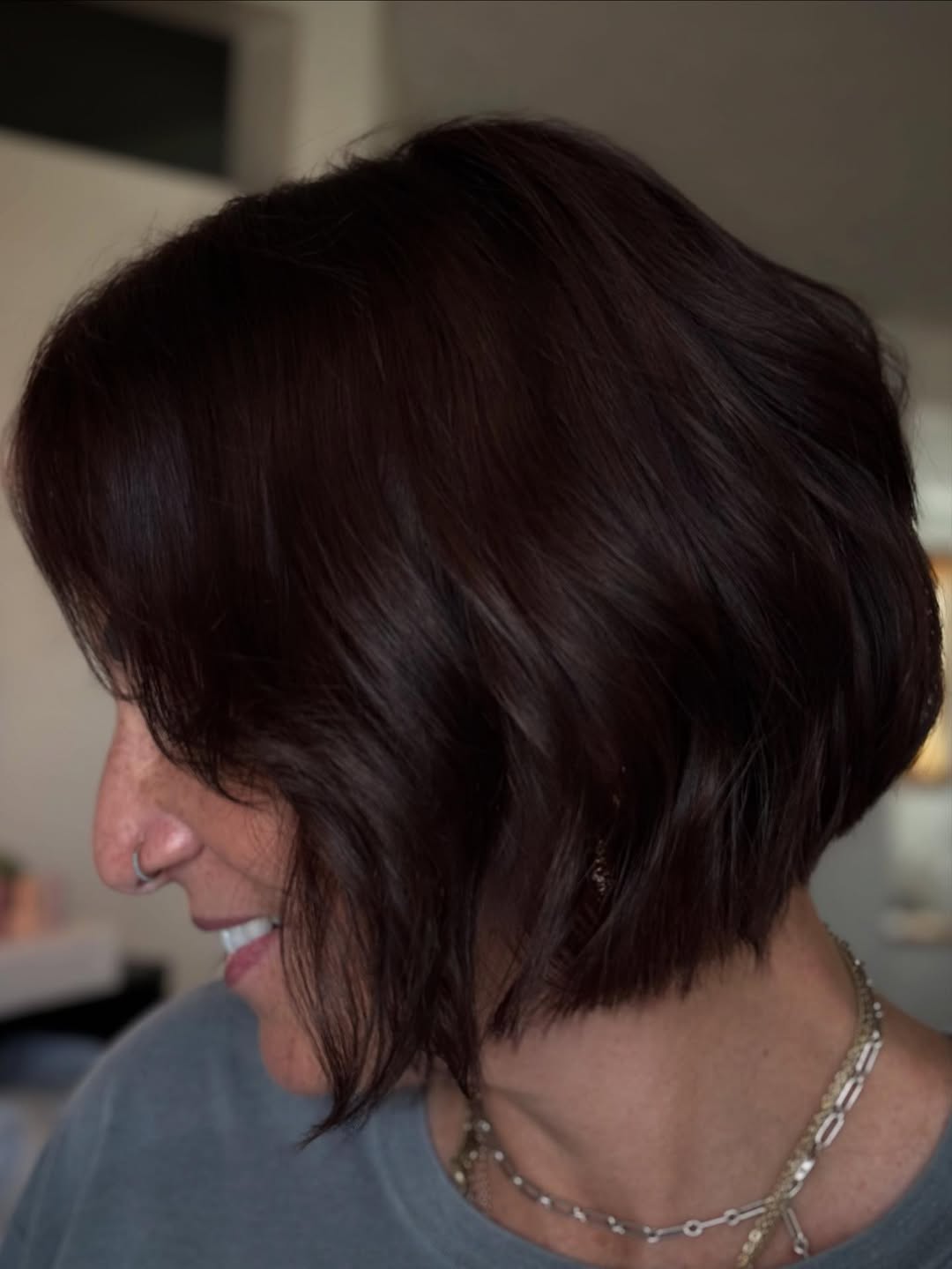 If you’re a fan of natural colors and short haircuts, you will like this voluminous, neck-length style with a natural texture. The trick is to build some weight in the crown with a subtle graduation. The added texture will also create density and volume around the top.