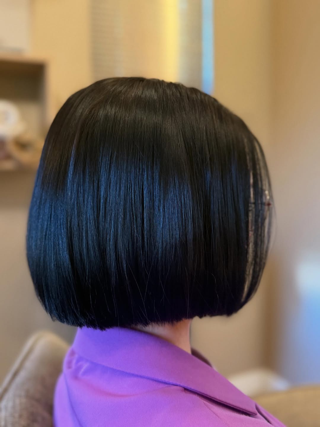 This cut has a heavy, solid-weight line to showcase the edge of the hairstyle. The look will play out nicely for thick tresses, keeping its solid shape and volume.