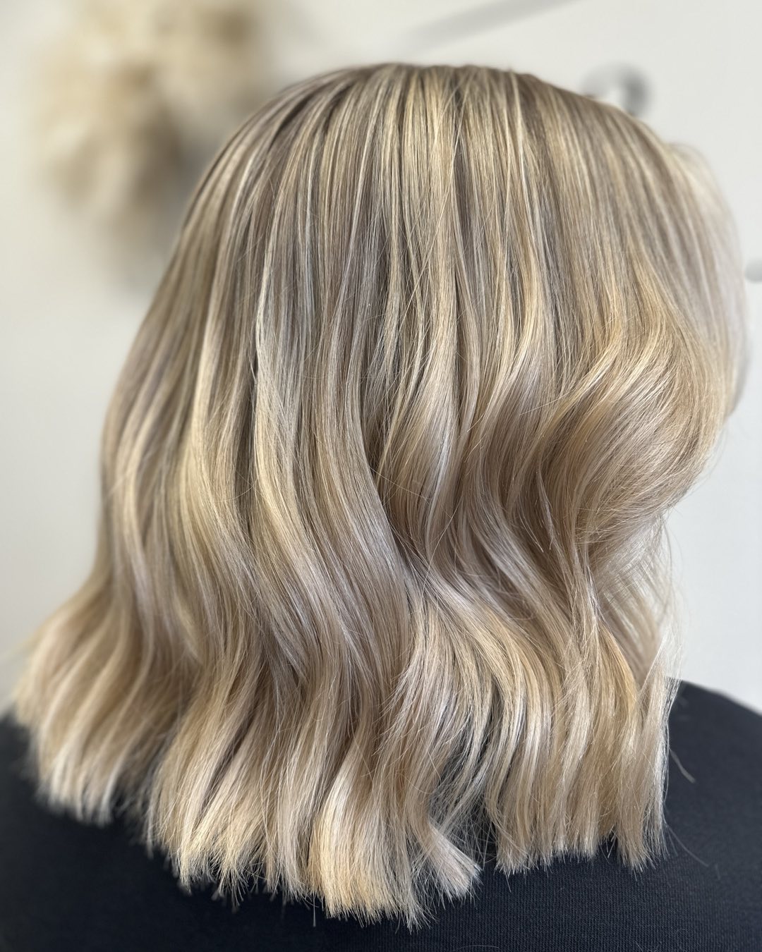 A bright sandy blonde hair color sets the stage for this medium-length crop, finished off with a sleek side part. There is also a combination of highlights and lowlights to give the hair more depth and definition.
