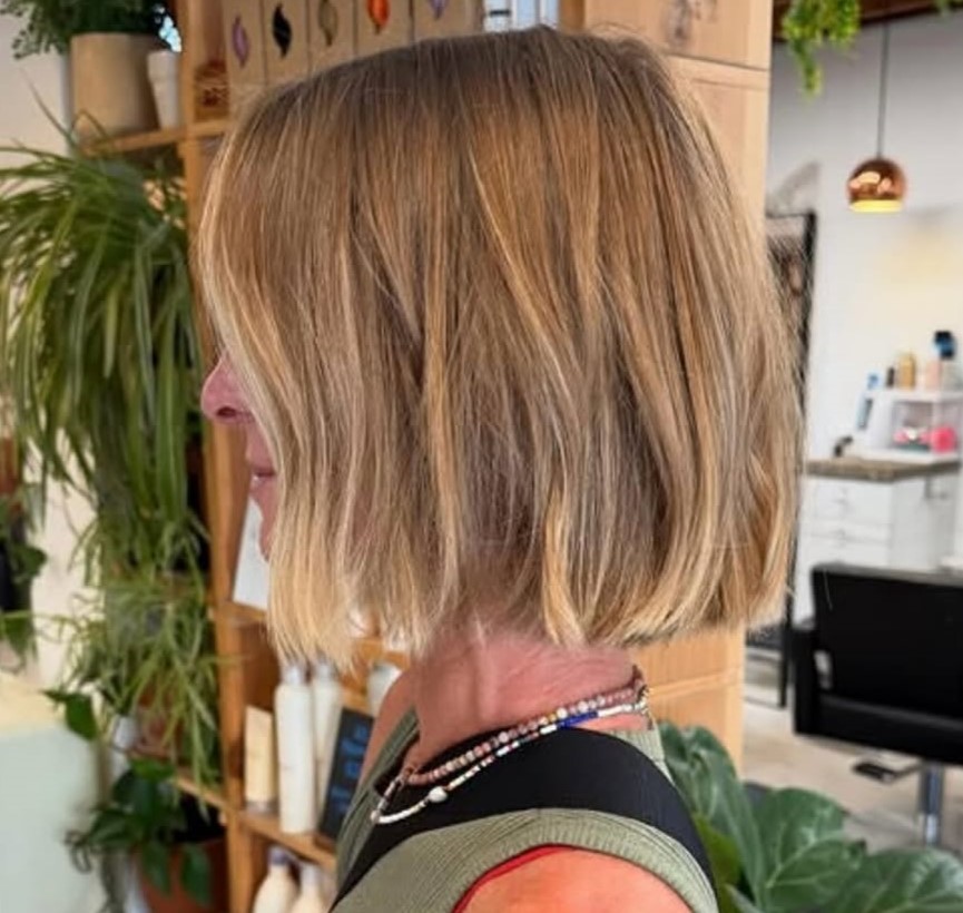 So modern, yet so simple. This cut allows for the ease of balayage strands to fall as they may. The pretty sun-kissed blonde color is easy to maintain. Introduce some texture with a dab of styling product, and you are ready to shine with a new hairdo.