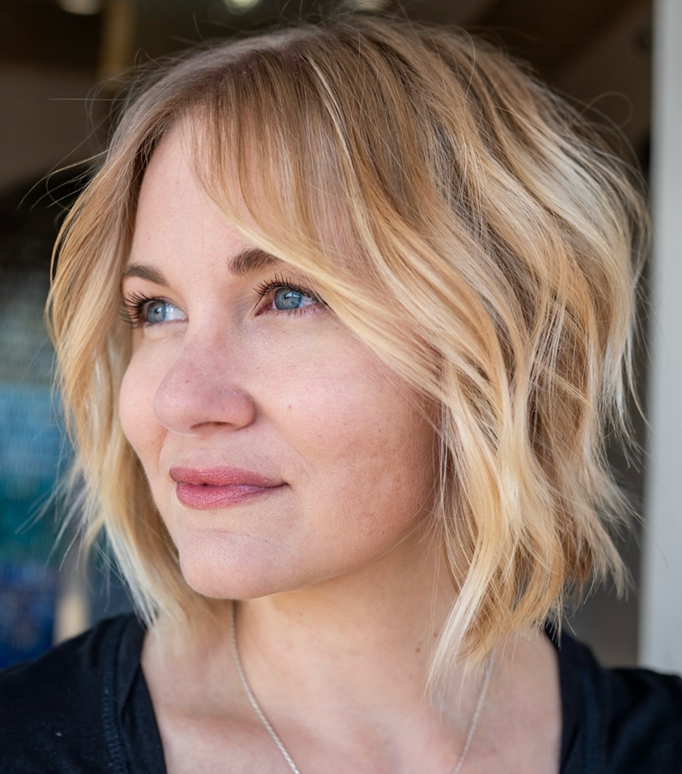 A messy bob could be your way to go if you have thin hair and a round face. A quick tip: it looks more flattering with beach waves than worn straight. Loose waves add volume that steals the show from the plump cheeks.