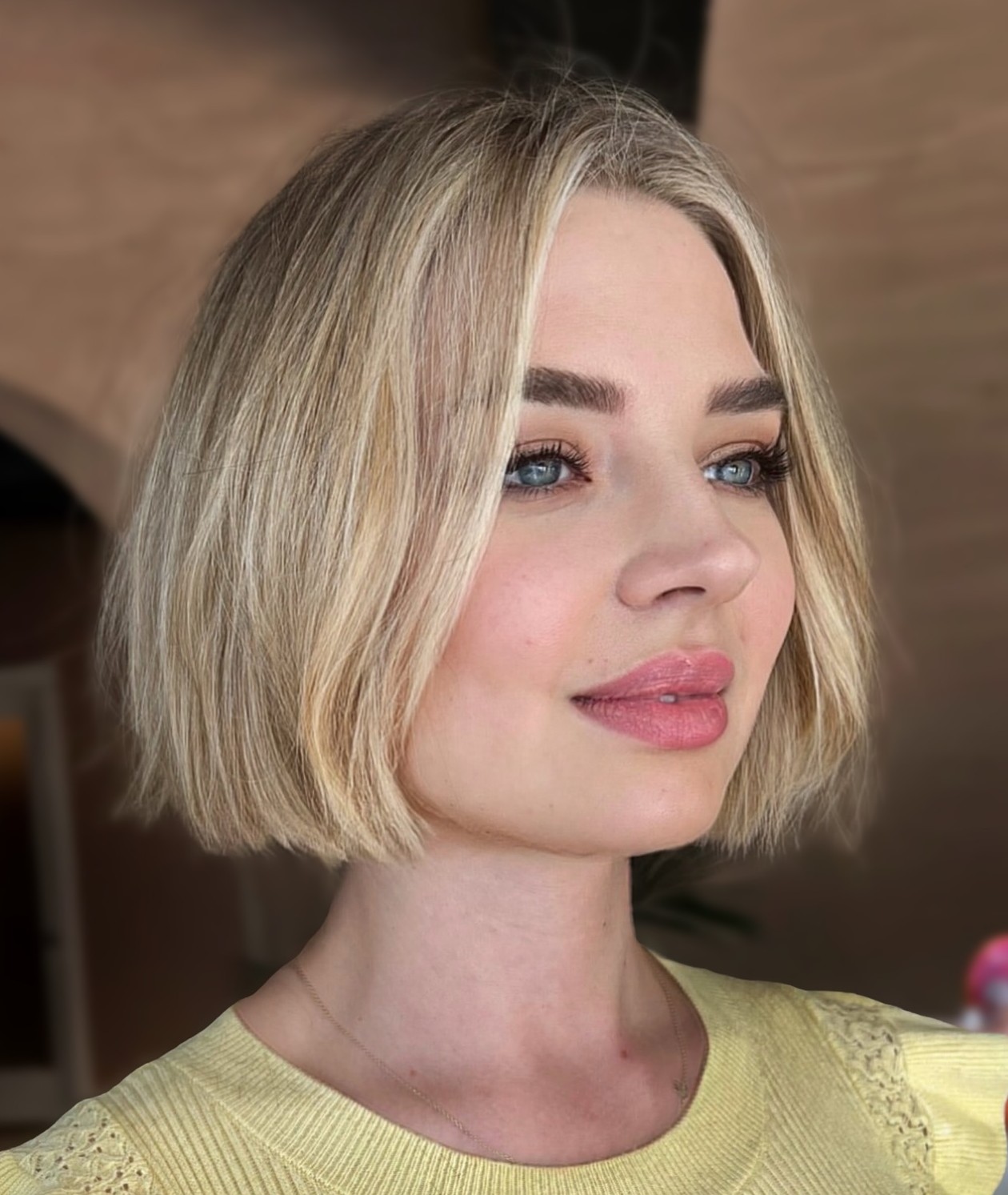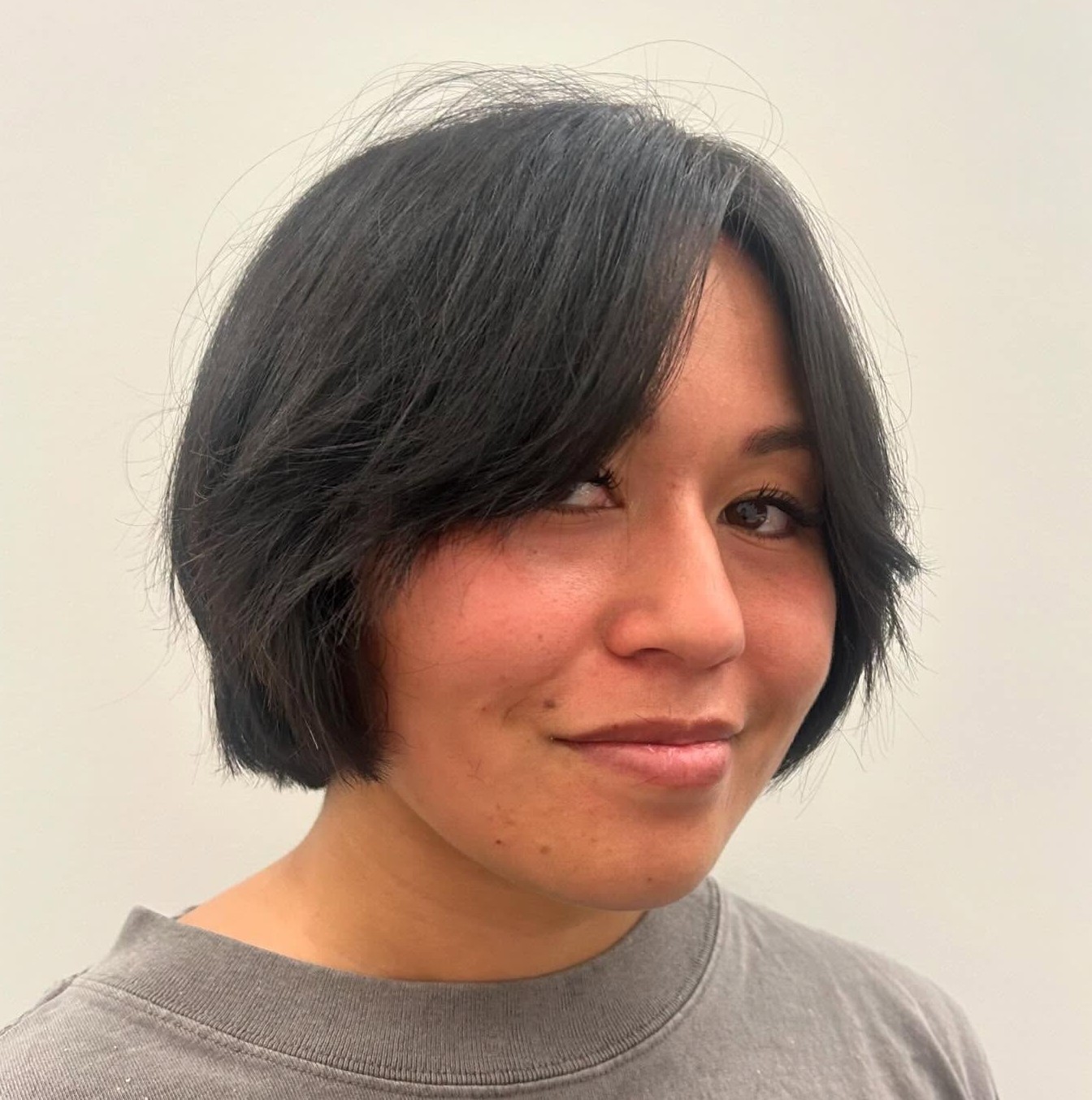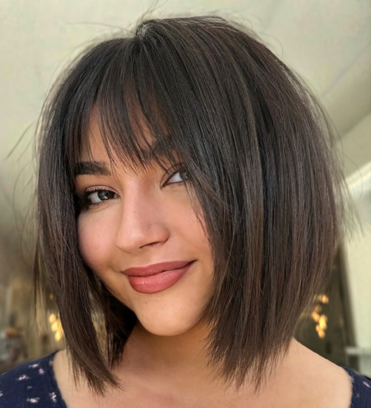 While a blunt haircut might not give your hair enough volume, a small trick can totally change the situation. Making the crop a bit angled towards the front and adding soft face-framing bangs visually reduces the flatness.