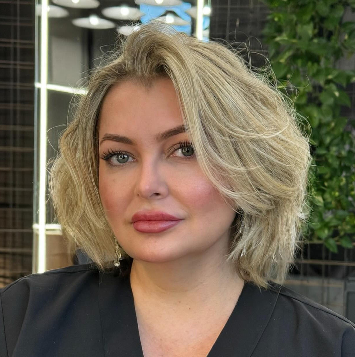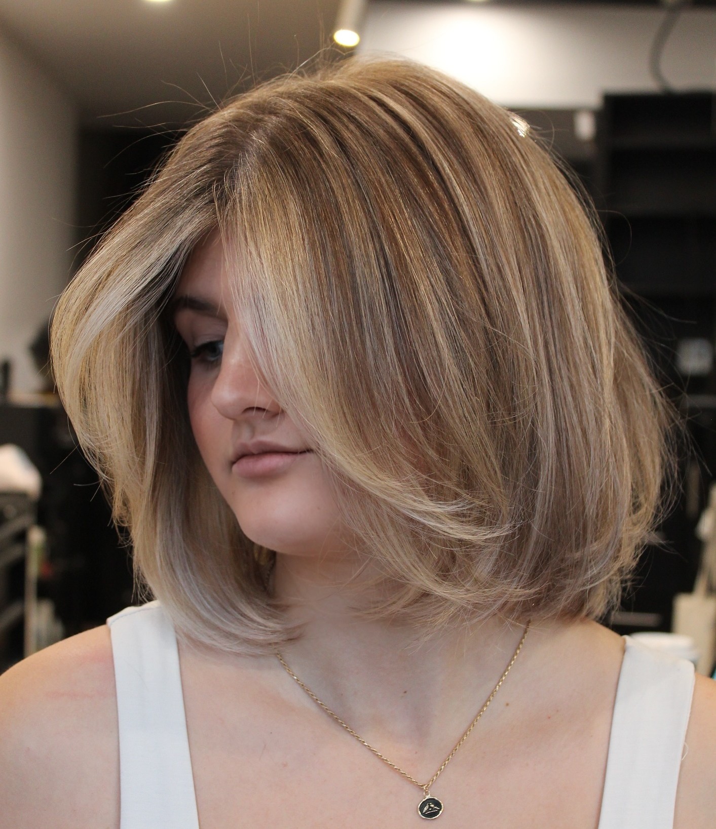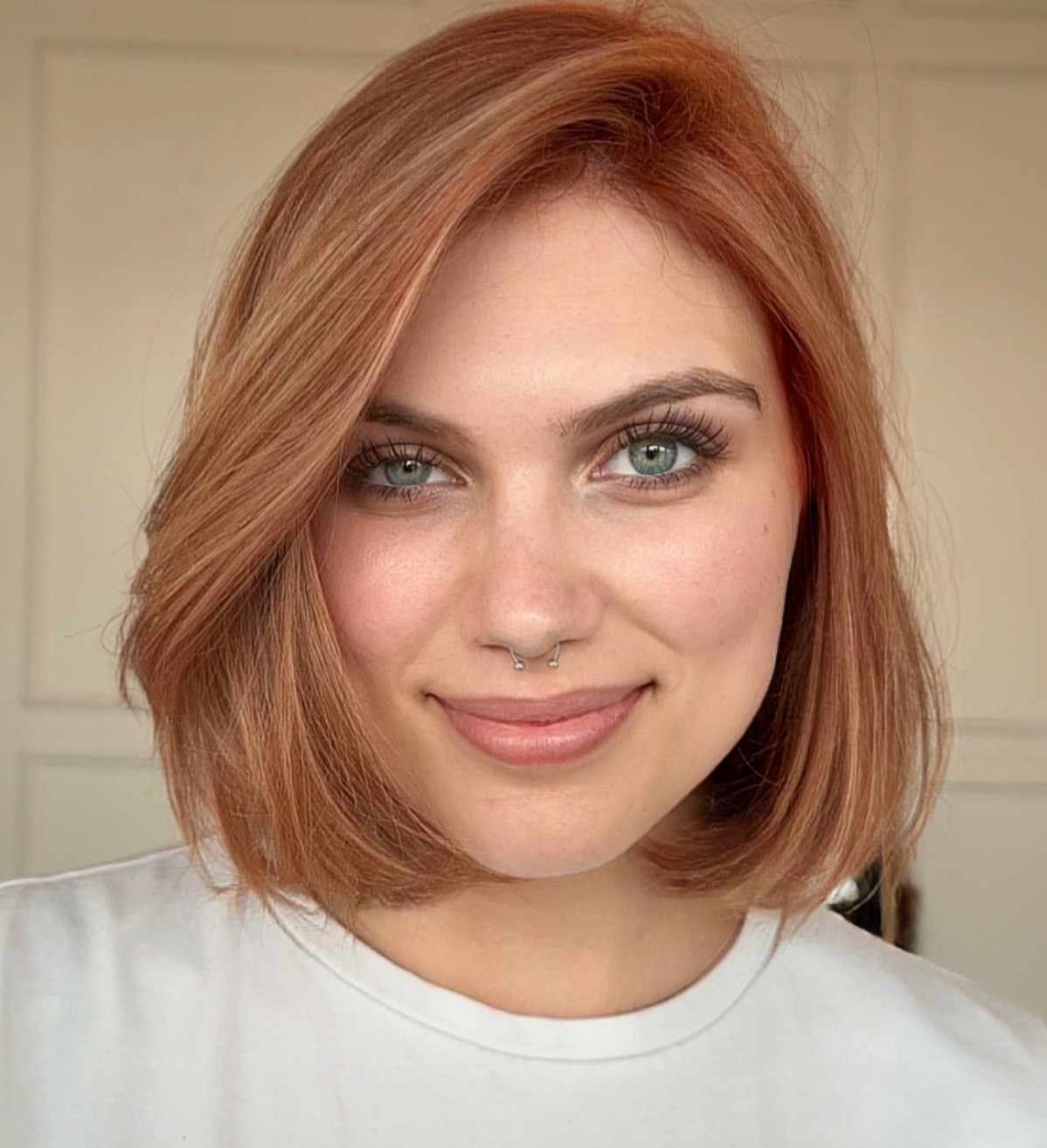 Without any doubt, a one-length cut with a slightly stacked nape is one of the most flattering shapes for a curved jawline. What is more, this hairstyle is incredibly versatile due to a wide choice of color options and partings – middle, side, irregular – you choose it!