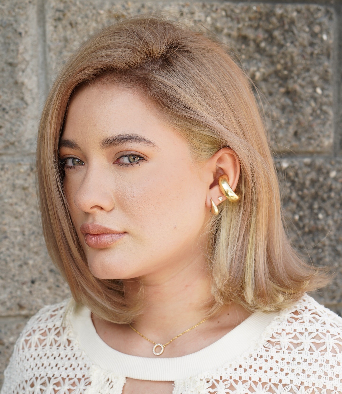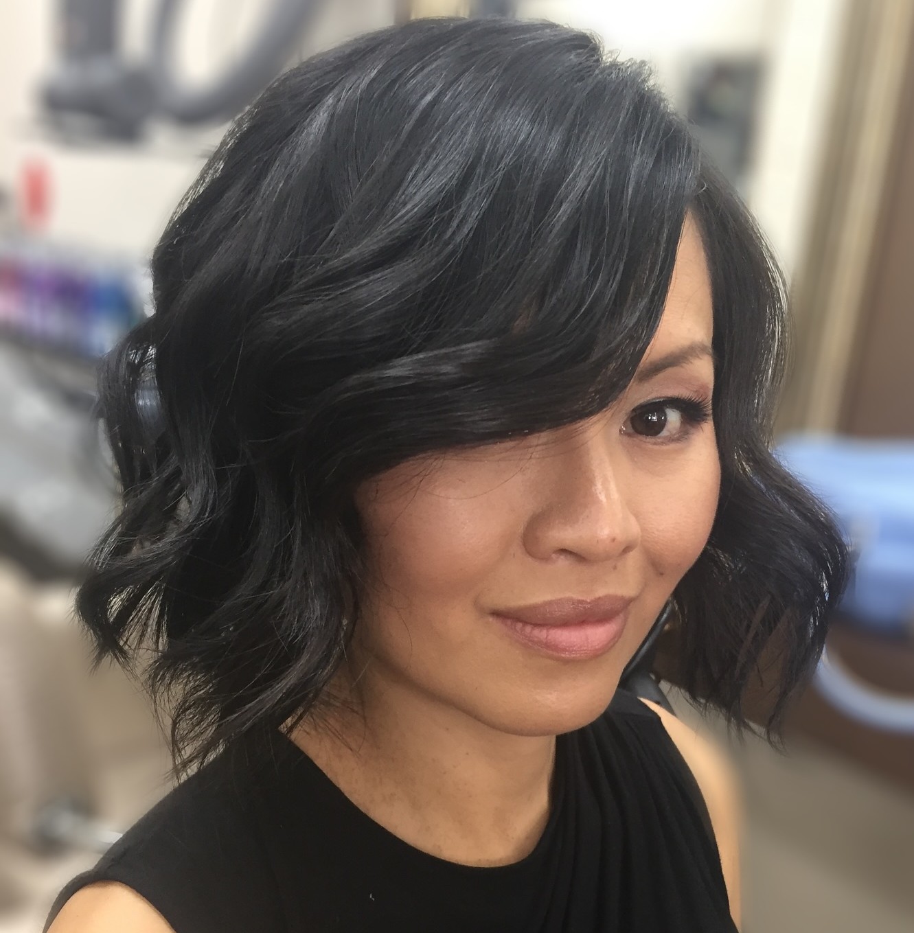 Shorter hair can also be curled with the right tools and styling. Showcase soft, finger-combed waves instead of tight ringlets for a look that is current and relevant. Plus, it won’t contrast with your fashion-forward blunt bangs.