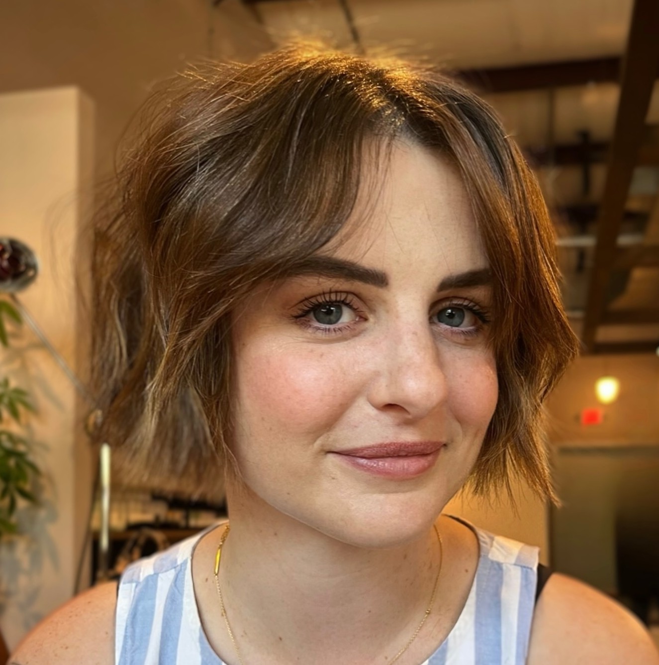 For this look, rounded ends and messy bangs visually change the shape of the face, while a few messy strands along the sides add movement and dimension to straight hair. This chop also pairs well with glasses.